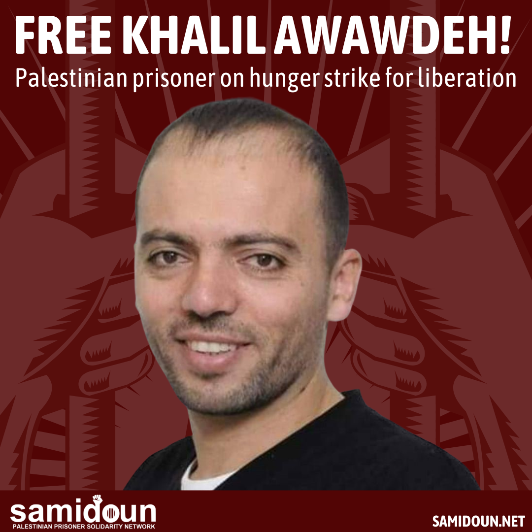 Samidoun Palestinian Prisoner Solidarity Network urges all supporters of Palestine to take action to support Khalil Awawdeh and save his life. Awawdeh is confronting the Zionist occupation forces with his body and life on the line. We urge action to free Awawdeh and all Palestinian prisoners struggling for freedom, for themselves and for Palestine and its people, from the river to the sea.