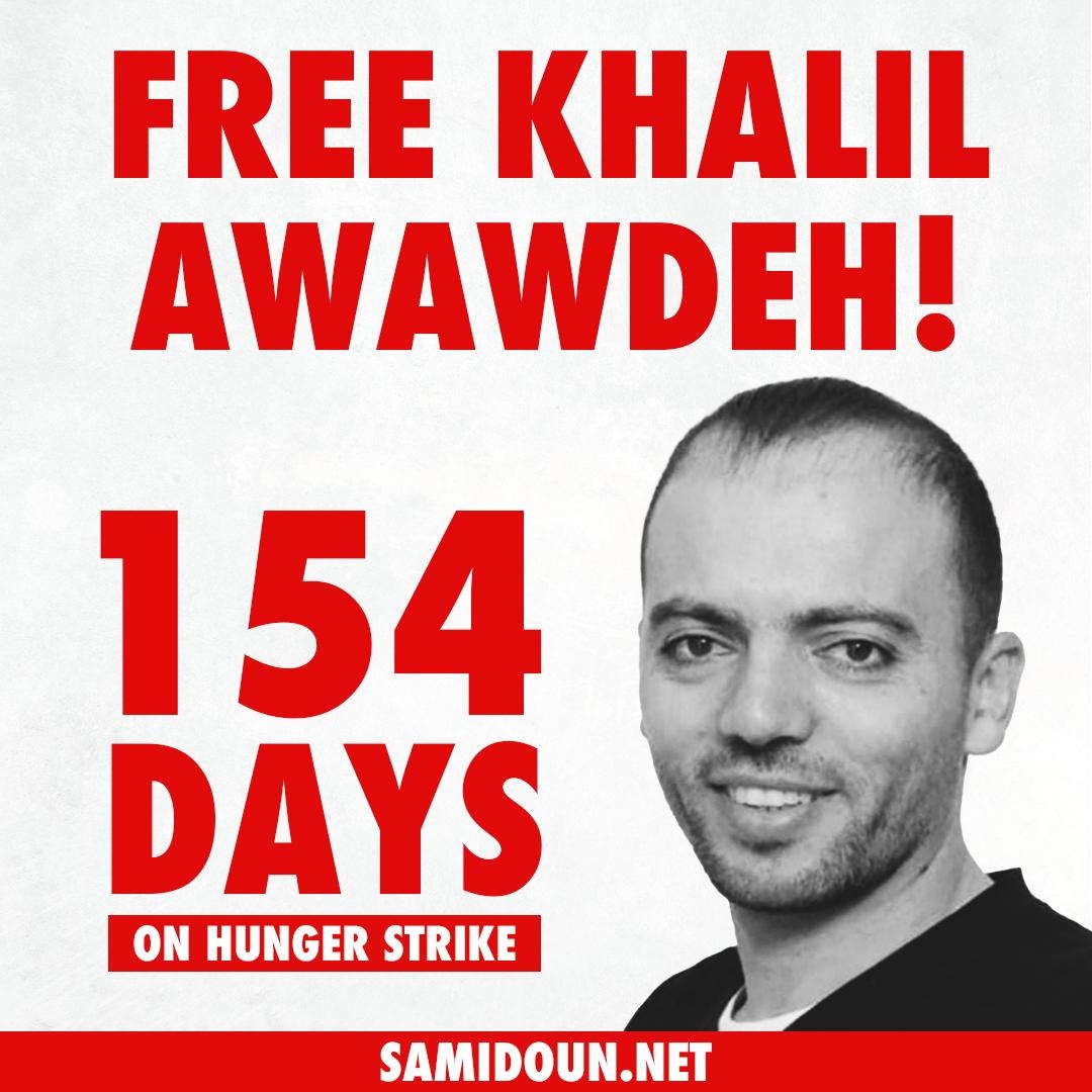 Khalil Awawdeh is continuing his hunger strike for the 154th day as his health condition continues to deteriorate. Awawdeh, 40, from Idna near al-Khalil, is on hunger strike to end his detention without charge or trial under Israeli “administrative detention.”