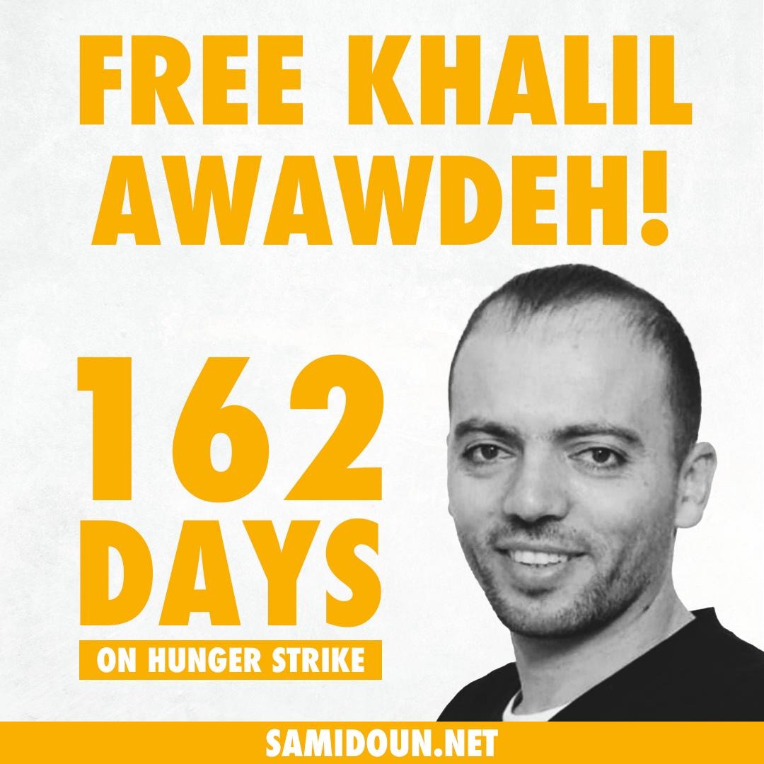 A note on the strike dates of Khalil Awawdeh: Some media sites report that this is the 162nd day of Khalil Awawdeh’s strike while others report it as the 152nd day. By saying 162 days, we are following the lead of Awawdeh’s family and loved ones, who do not recognize and cannot confirm the interruption in his hunger strike when he was told an agreement had been reached for his release on 21 June. Both of these are valid dates and both emphasize the importance of urging his freedom. Notably, his family never confirmed a suspension or end of his hunger strike at that time. Instead, his administrative detention was extended and he officially reported resuming his strike to his lawyer on 2 July.