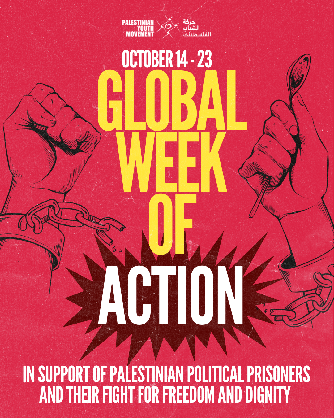 Samidoun Palestinian Prisoner Solidarity Network is joining the Palestinian Youth Movement and over 30 other organizations, to call upon all supporters of the Palestinian struggle to join us on October 14th – 23rd for a week of action in support of Palestinian political prisoners and their fight for freedom and dignity.