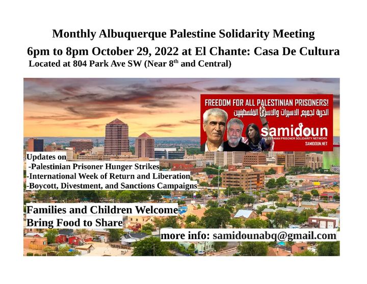 We invite all in Albuquerque to join us for our first monthly Albuquerque Palestine Solidarity Meeting. 6pm October 29 at El Chante (804 Park Ave SW). Families and Children welcome!
