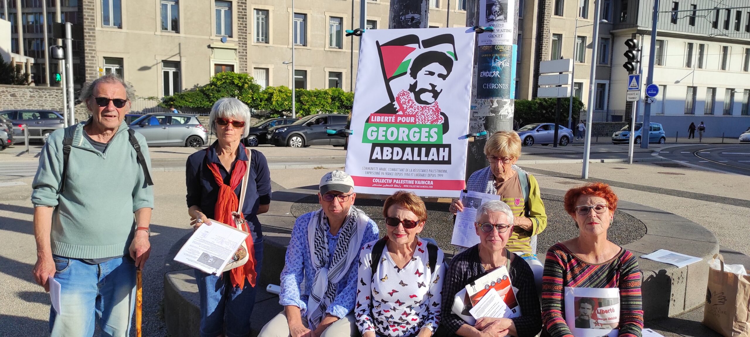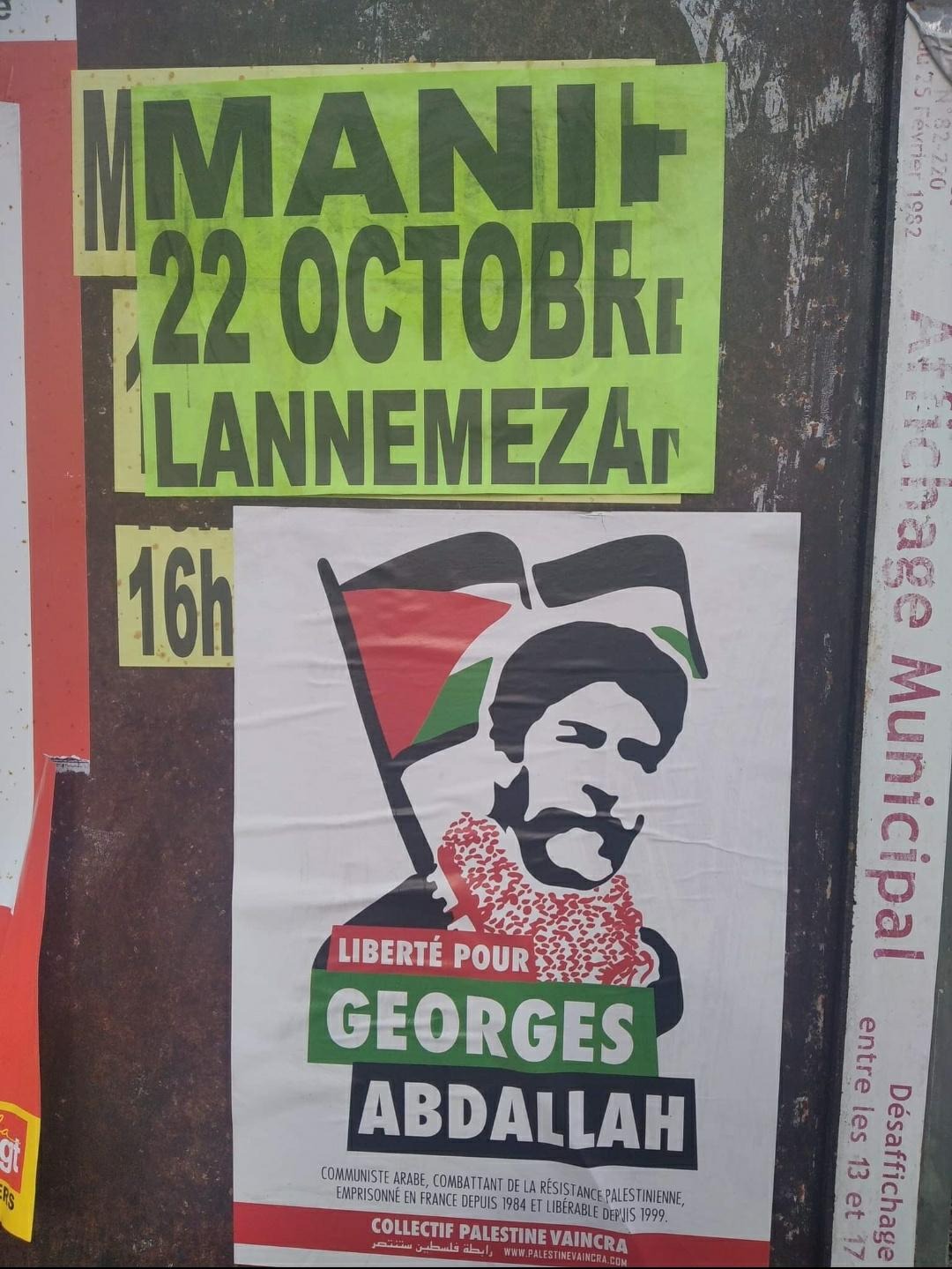Collectif 32 for the release of Georges Abdallah postered for the release of Georges Abdallah throughout the month of mobilization and participated in several demonstrations with signs and banners.