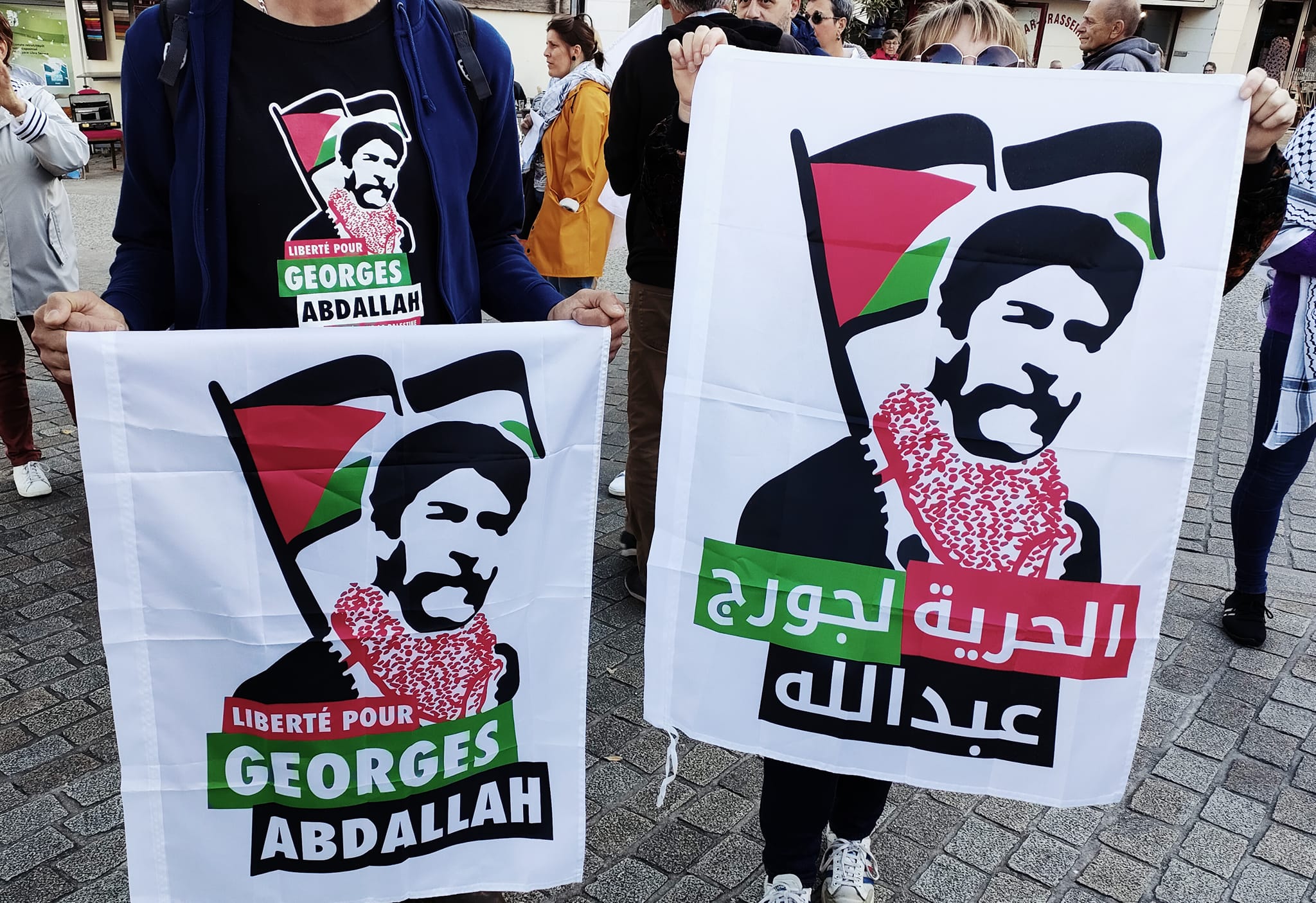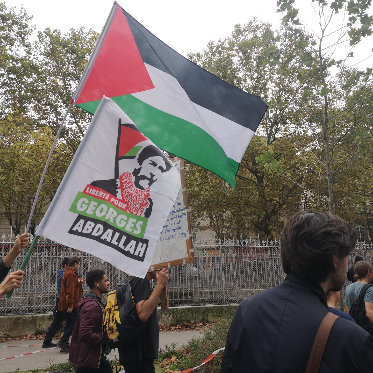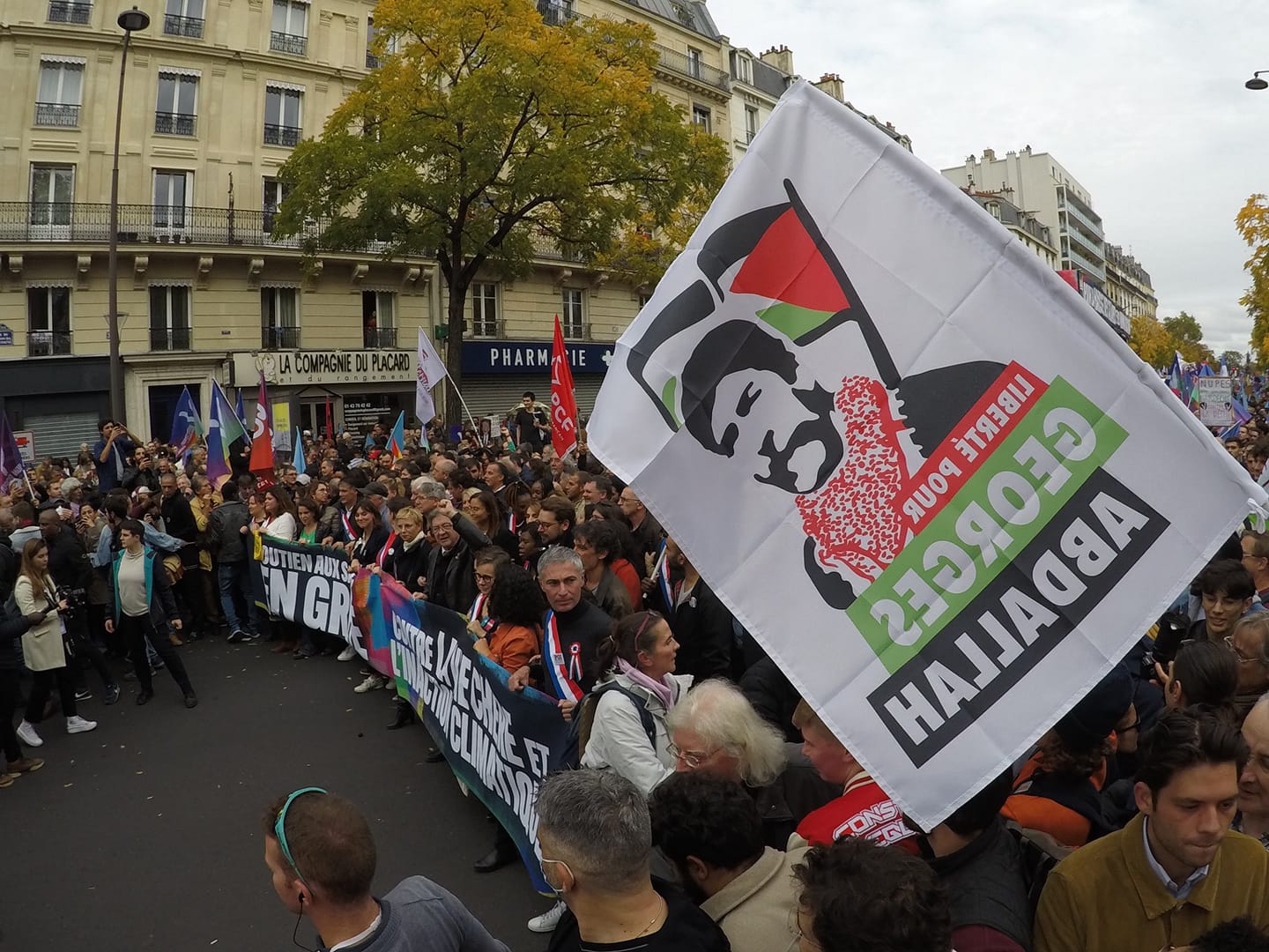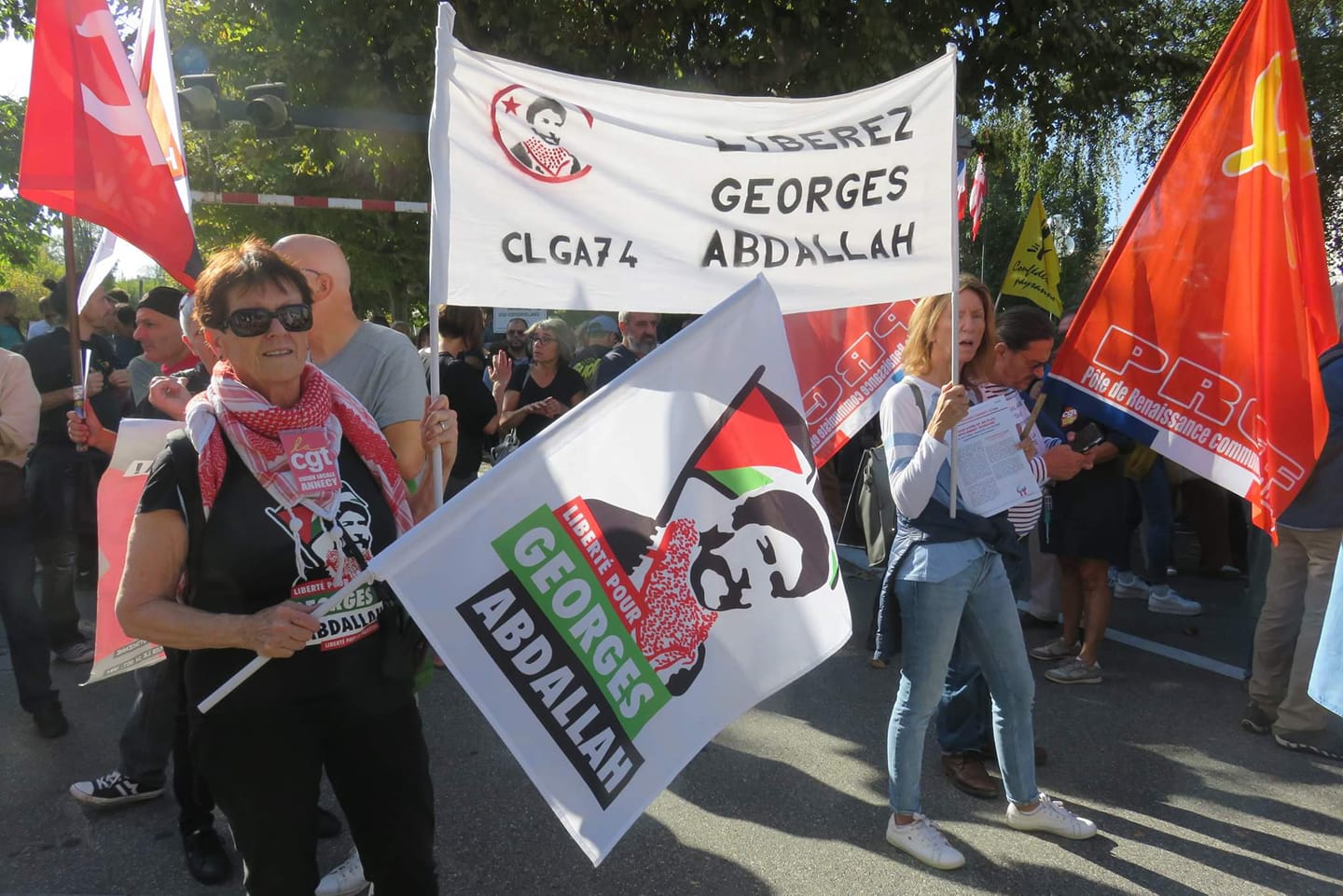 The Collective for the Liberation of Georges Abdallah 74 mobilized on several occasions in Annecy, in particular during the one-day strike of 18 October by displaying a banner and flags of support in the trade union demonstration.