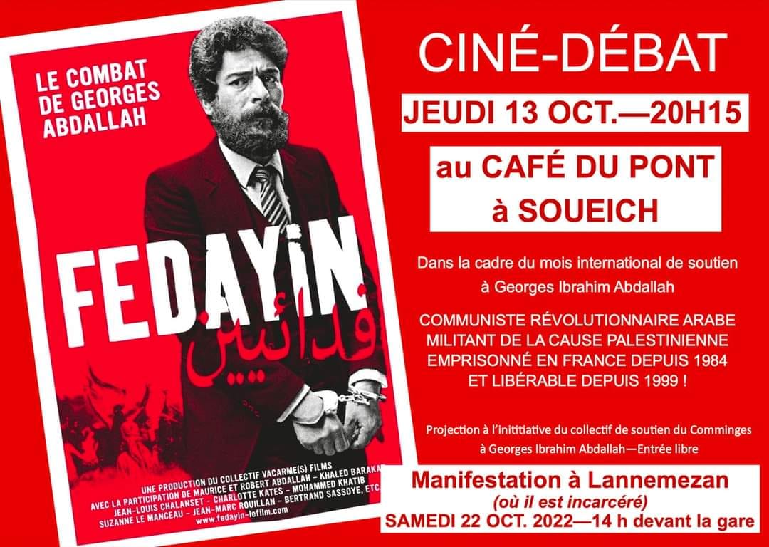 In this region south of Toulouse, a new support committee for Georges Abdallah was founded thanks to the support of several unions and organizations (particularly LFI , the PCF and the Union Syndicale Solidaires). The latter organized several actions, in particular screenings of “Fedayin: Georges Abdallah’s Fight” in Soueich on October 13 and in Valentine on October 21. In addition, they organized several carpools from Saint-Gaudens and Cazère to participate in the demonstration on Saturday October 22 in Lannemezan.