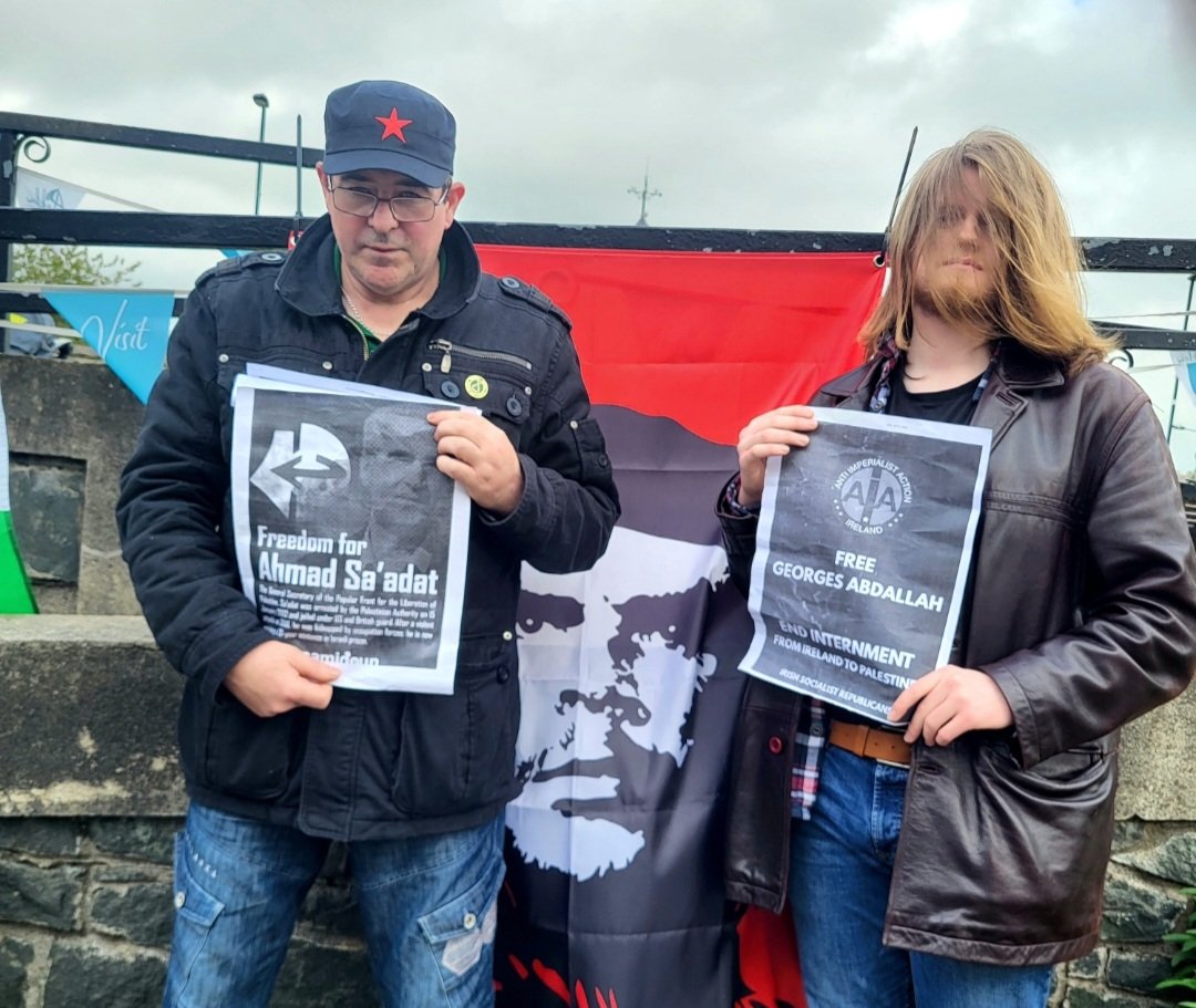 Irish socialists from the town of Arklow took a solidarity photo for the release of Ahmad Sa’adat and Georges Abdallah.