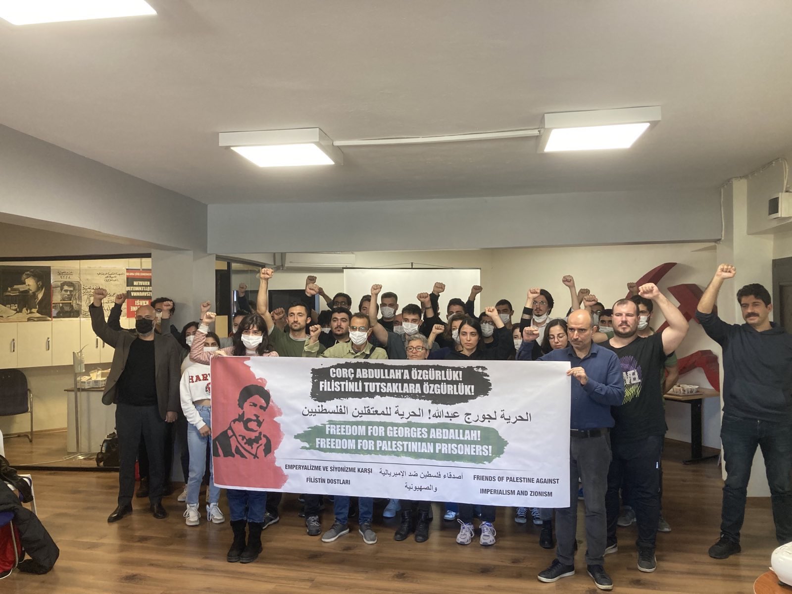 The Friends of Palestine Against Imperialism and Zionism organized a screening of “Fedayin” in the premises of the DIP in Istanbul on 22 October. On this occasion, the participants wrote several support cards and took a photo to underline their commitment to the liberation of the Lebanese communist.