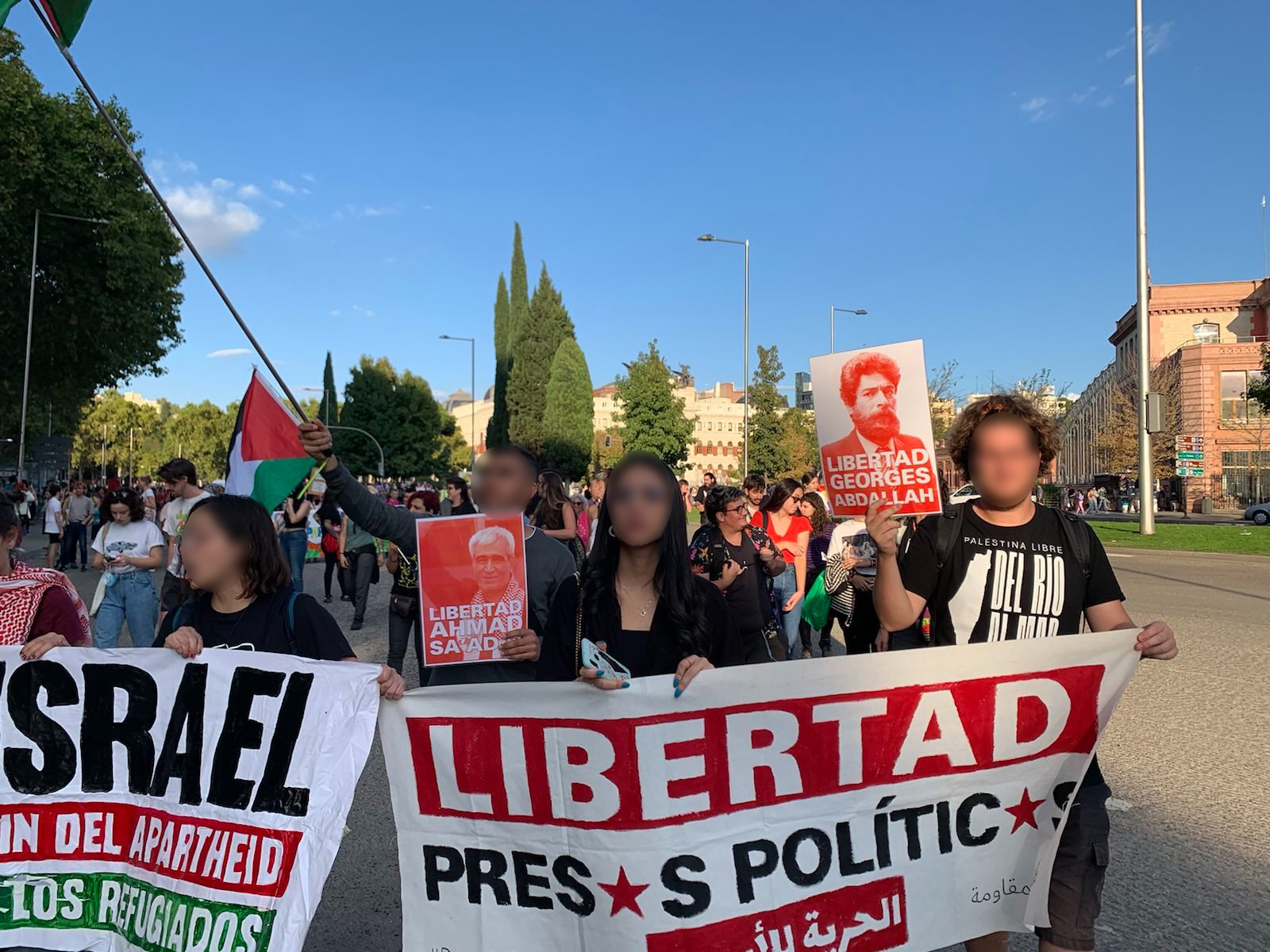 During an anti-colonial demonstration on 12 October in Madrid, the contingent of Samidoun España displayed several banners in support of Palestine and posters for the release of Ahmad Sa’adat and Georges Abdallah. In addition, Samidoun Spain also organized a new Madrid screening of “Fedayin: Georges Abdallah’s Fight” on 8 October with CGT Metal, the metalworkers trade union.
