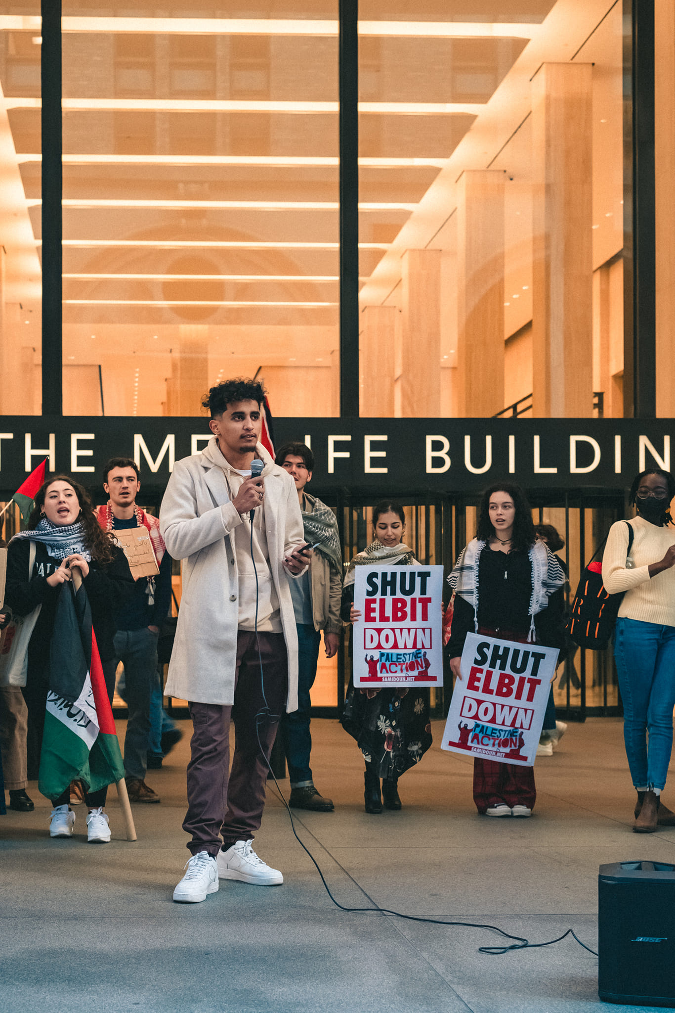 Demonstrators in New York City gathered on Sunday, 9 October to stand in solidarity with Palestine Action and build the campaign to #ShutElbitDown. The demonstration, organized by Samidoun NY/NJ, Within Our Lifetime and the Palestinian Youth Movement, gathered outside the MetLife building, which has offices of both the Bank of New York Mellon Corporation and Barclays. The two banks are major investors in Elbit Systems, the notorious Israeli arms manufacturer marketing and profiting from the death, colonization and oppression of the Palestinian people.