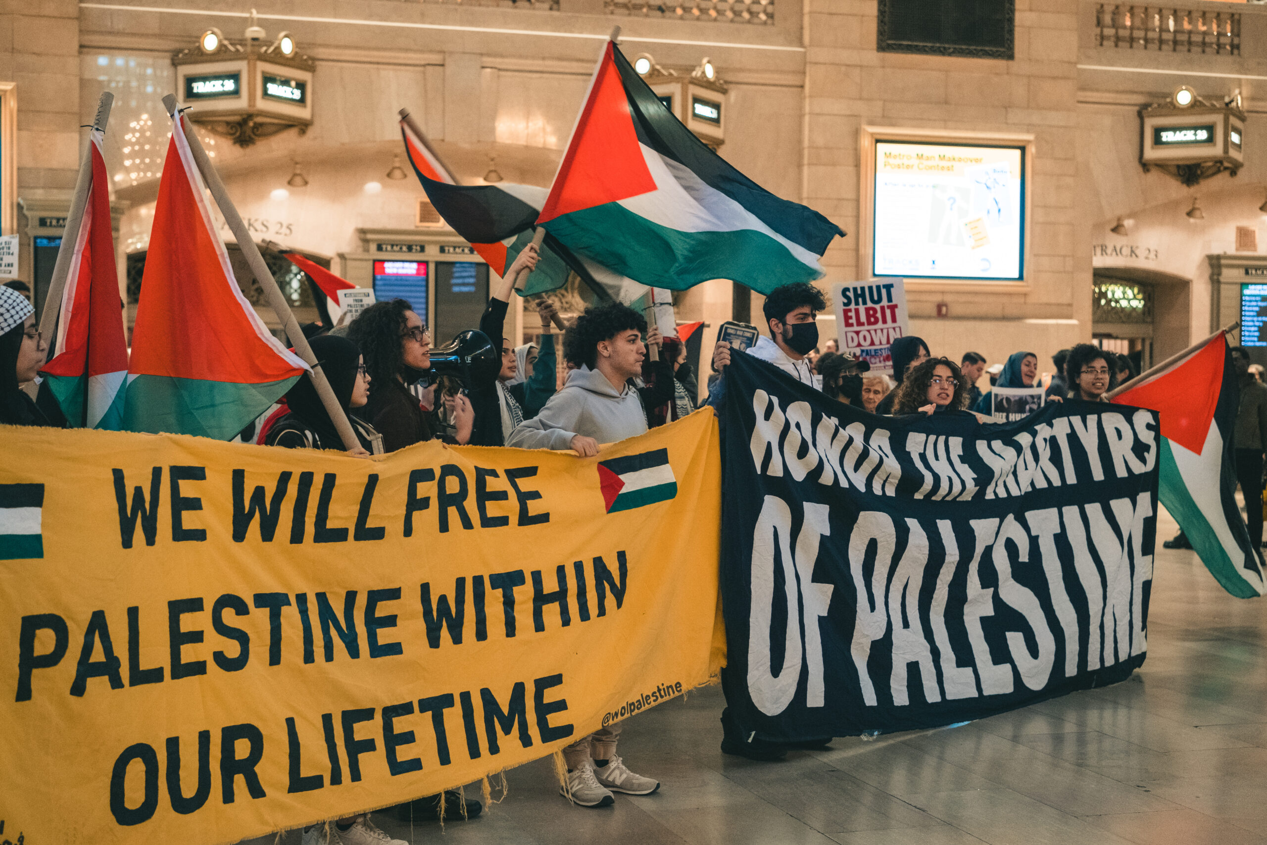 After the rally outside the MetLife building, participants marched through the building on the ground floor to Grand Central Terminal as the large station echoed with chants and calls for Palestinian liberation. Demonstrators then marched to the British consulate, rallying in a courtyard in the tower’s property and demanding British officials end their ongoing prosecutions of Palestine Action activists in support of Elbit’s arms manufacturing.