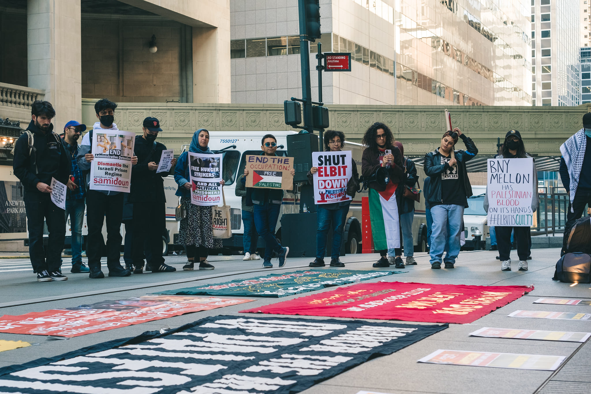 Both the Bank of NY Mellon and Barclays, whose major offices in the US are right in this building, underwrite these murderous quote unquote innovations. They assure Elbit continues to profit from the genocide of Palestinians.