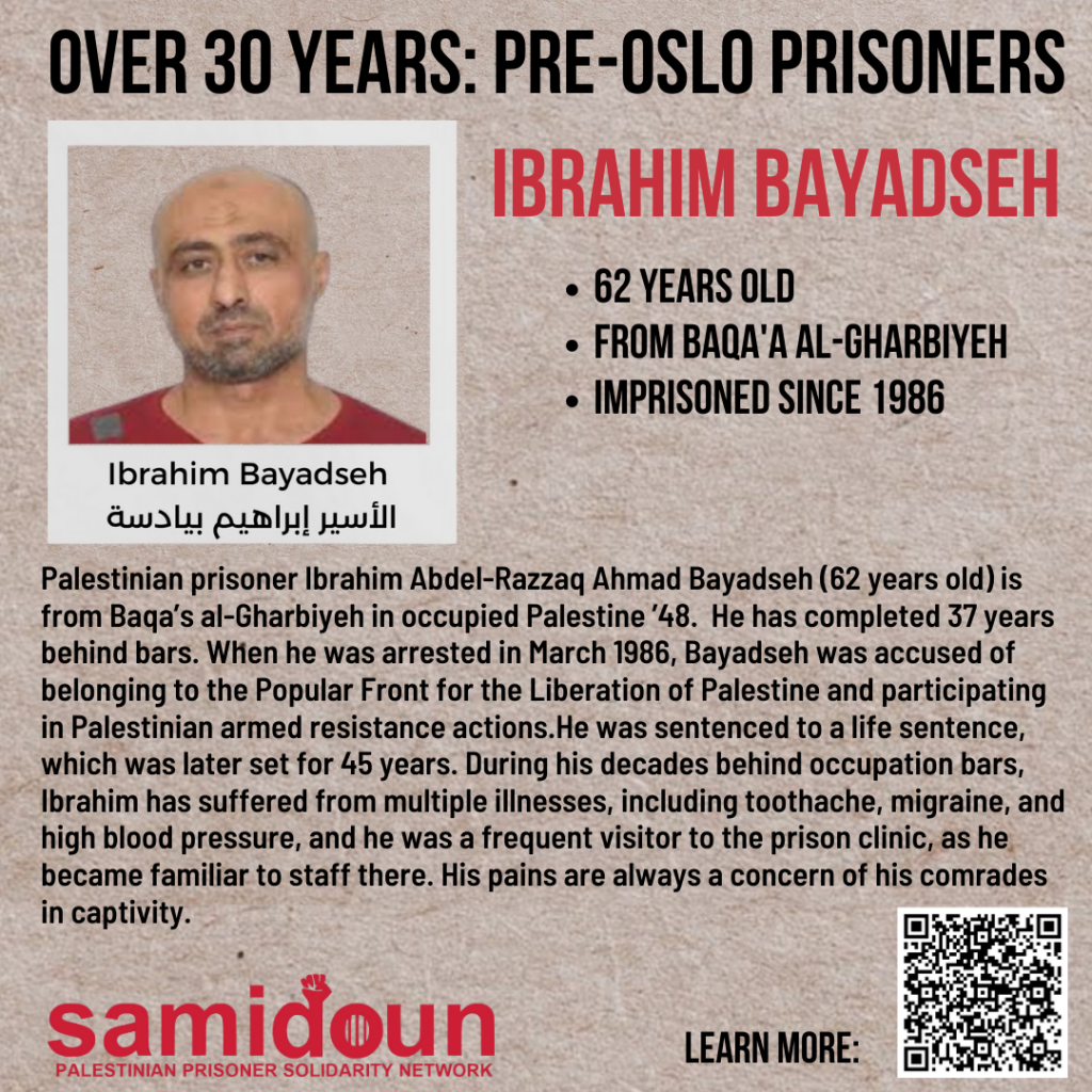 Ibrahim Bayadseh is one of the 30 veteran prisoners arrested before the Oslo agreement. The Zionist authorities refused to release them in any previous prisoner exchange or agreement with the occupation, despite widespread demand. As a Palestinian prisoner from occupied Palestine ’48, he was labeled an “internal Israeli matter.”