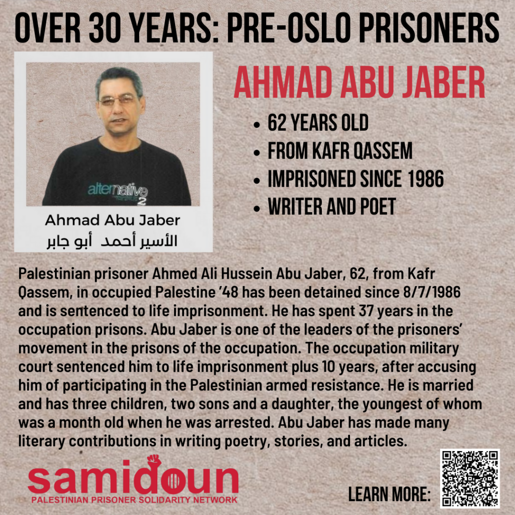 Palestinian prisoner Ahmed Ali Hussein Abu Jaber, 62, from Kafr Qassem, in occupied Palestine ’48 has been detained since 8/7/1986 and is sentenced to life imprisonment. He has spent 37 years in the occupation prisons. He is one of the veteran prisoners arrested before the Oslo Accords in 1993 whose release was promised in an agreement and then unilaterally rescinded by the Israeli occupation. Abu Jaber is one of the leaders of the prisoners’ movement in the prisons of the occupation. The occupation military court sentenced him to life imprisonment plus 10 years, after accusing him of killing an Israeli soldier and an agent of the occupation. He is married and has three children, two sons and a daughter, the youngest of whom was a month old when he was arrested. Abu Jaber has made many literary contributions in writing poetry, stories, and articles. Several years ago, the occupation authorities refused to set a time limit for the life sentence for Abu Jaber, unlike other Palestinians from occupied Palestine ’48, because he had been tried at the Nablus military court. At the same time, he has been excluded from all prisoner exchanges and agreements between the occupation and the Palestinian resistance.