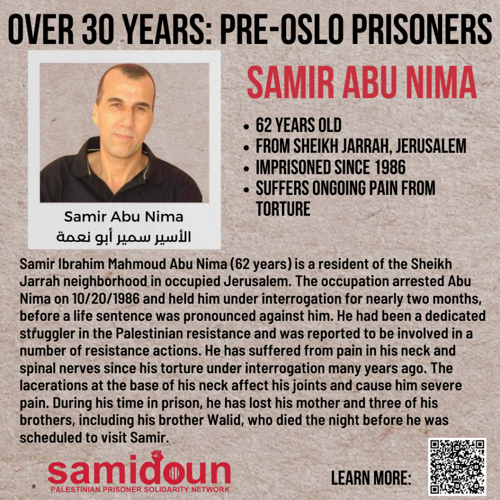 The prisoner Samir Ibrahim Mahmoud Abu Nima, 62 years old, is a resident of the Sheikh Jarrah neighborhood in the occupied city of Jerusalem. The occupation arrested Abu Nima on 10/20/1986 and held him under interrogation for nearly two months, before a life sentence was pronounced against him and he was transferred to Ramon prison. He had been a dedicated struggler in the Palestinian resistance and was involved in a number of armed resistance operations targeting Israeli occupation soldiers.