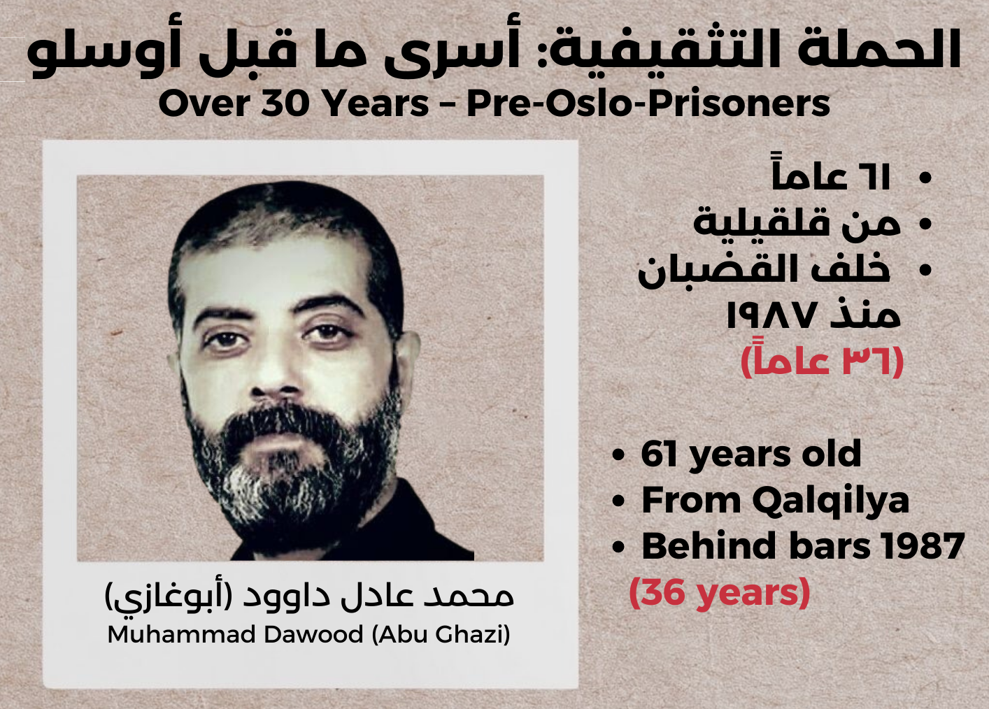 Muhammad Adel Hassan Daoud (Abu Ghazi) has been detained by the occupation since his arrest on 18 December 1987. A dedicated resistance struggler born in 1962, he was sentenced to life in prison for targeting the cars of illegal settlers on the Qalqilya bypass road, including the head of the Qalqilya area settlement council and for his role in the Fateh armed resistance. His family was subjected to collective punishment after his arrest and imprisonment, as the occupation confiscated their family home.
