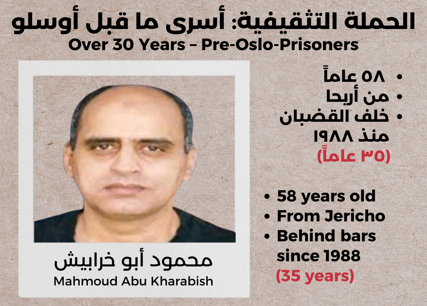 Palestinian prisoner Mahmoud Abu Kharabish was born in the city of Jericho, Palestine, in early June 1965. He was a farmer, affiliated with the Fateh movement, and is the longest-held Palestinian prisoner from the Jericho area. He was seized by occupation forces at the age of 23 on 31 October 1988 for throwing Molotov cocktails at a settler bus in Jericho during the great popular Intifada. He was seized by the Zionist authorities and sentenced to life imprisonment. Currently detained in the occupation’s Ramon prison, he has been held behind bars for nearly 35 years.