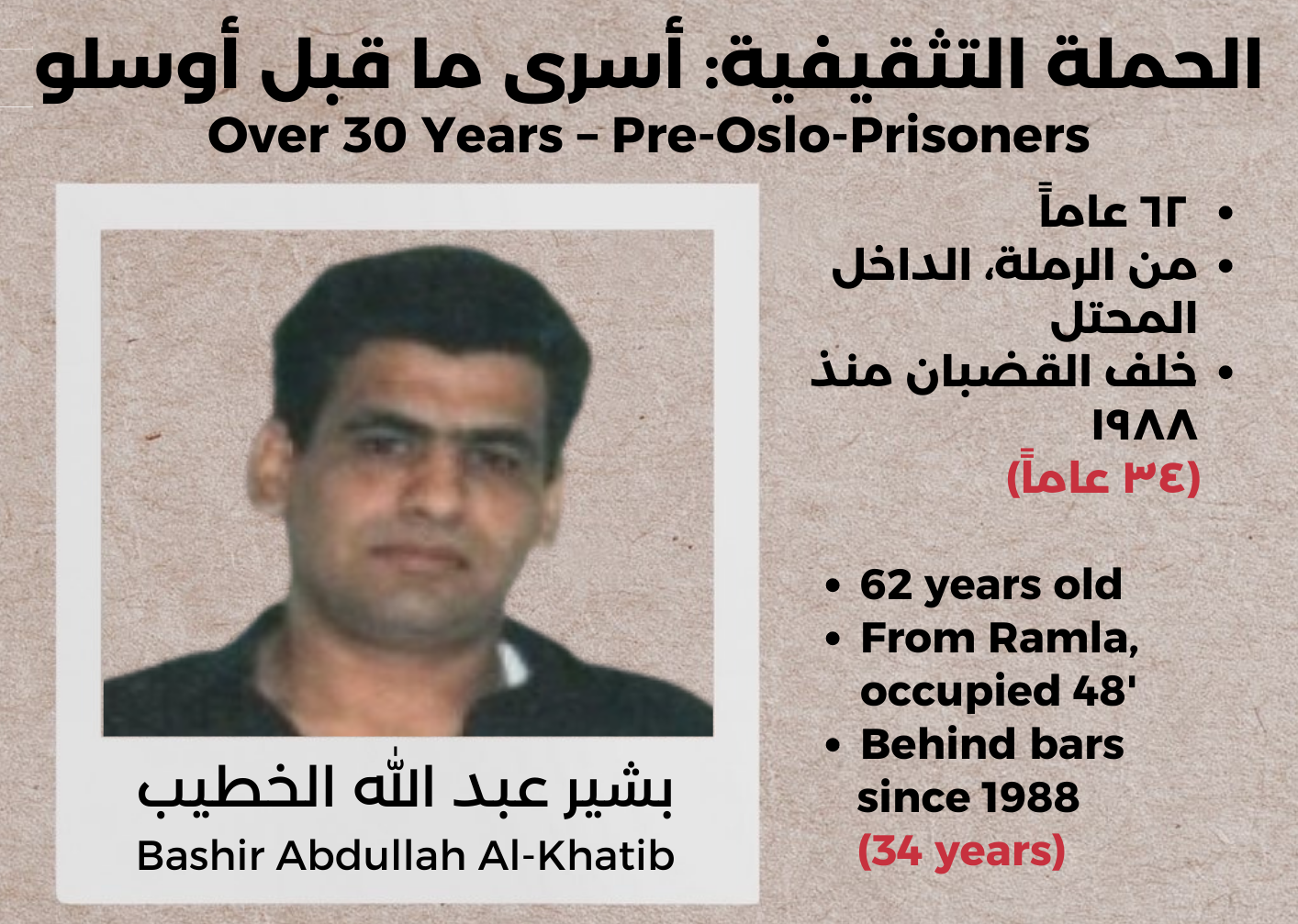 Palestinian prisoner Bashir Abdullah al-Khatib, 62 years old, from Ramla in occupied Palestine ’48, has been jailed for 34 years in the occupation prisons.