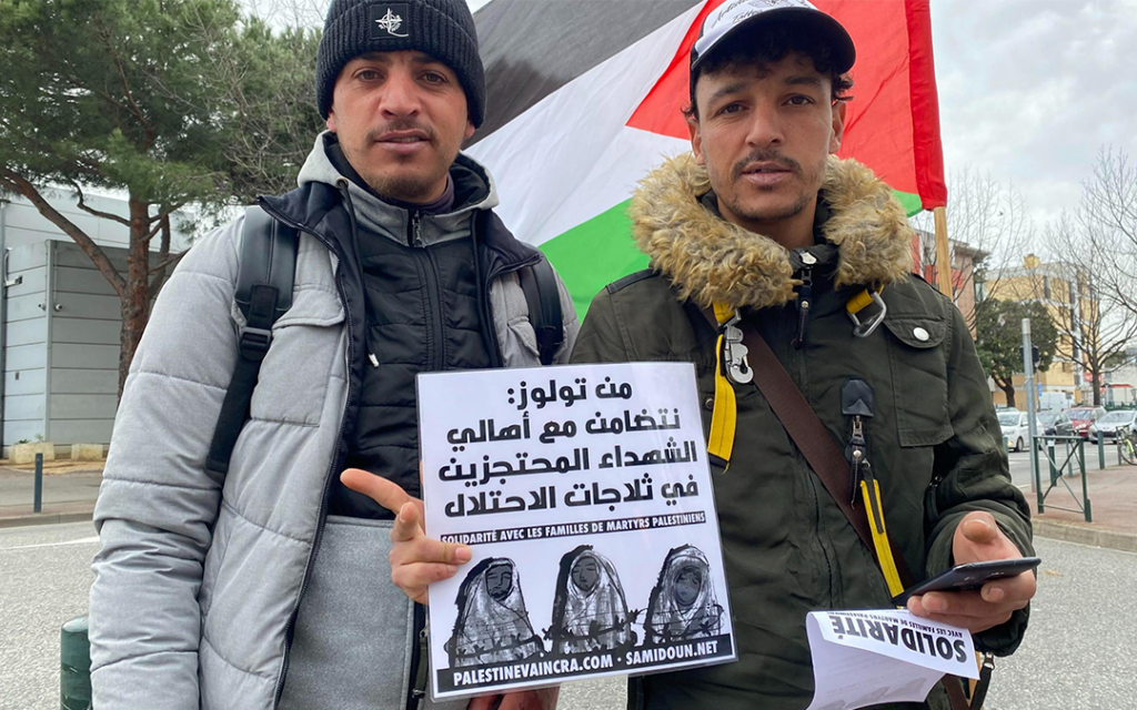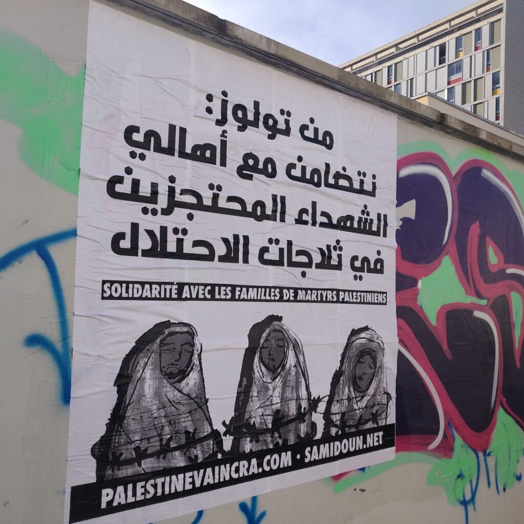 On Friday, 17 March, the Collectif Palestine Vaincra — a member organization of the Samidoun Network — organized a Palestine Stand at the Bagatelle metro station in Toulouse, France. The Stand came as part of the week of mobilization organized as part of the International Campaign to Liberate the Remains of Palestinian Martyrs detained in the morgues and “numbers cemeteries” of the occupation, a campaign endorsed by over 180 international organizations.