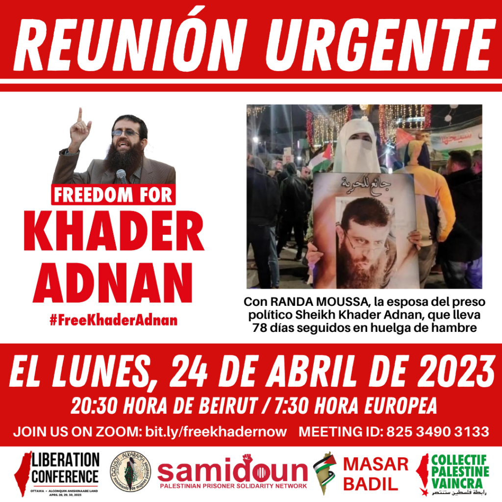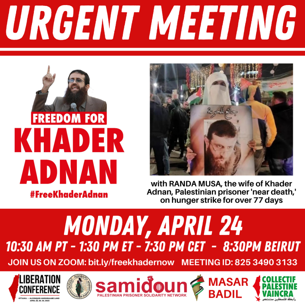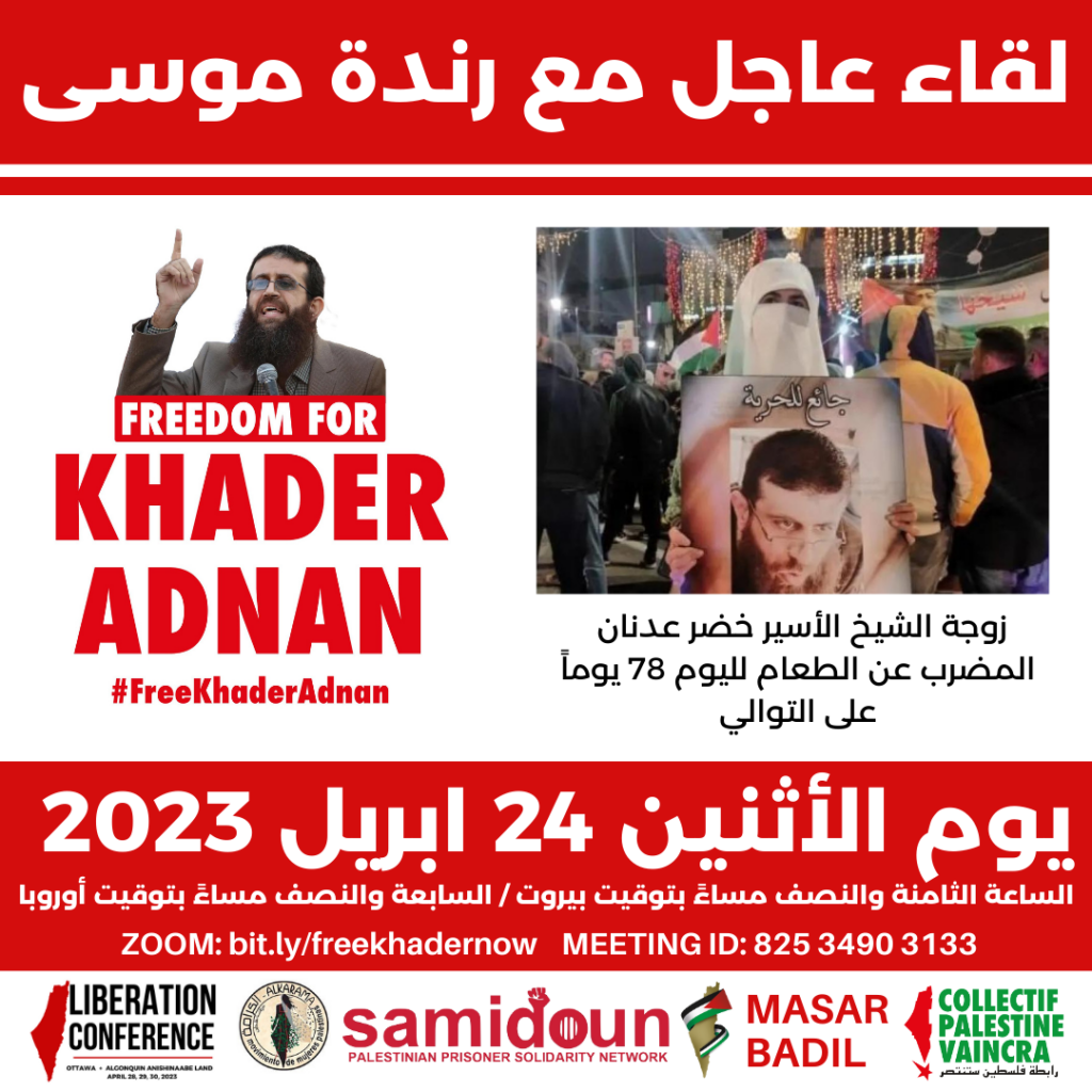 Join us on Monday, 24 April for an urgent meeting with Randa Musa, the wife of Khader Adnan, Palestinian prisoner on hunger strike for 78 days. Hear directly from her about how her husband’s deteriorating health condition is affecting her family and join us in organizing to take action to free Khader Adnan now!