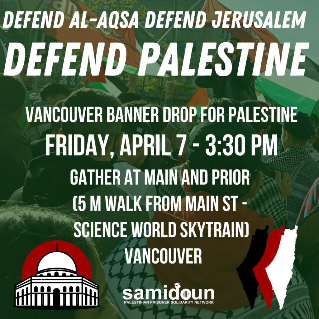 Defend Al-Aqsa, Al-Quds, Palestine! Long Live the Resistance! Vancouver solidarity-resistance-liberation banner drop for Palestine. All welcome to join us: the more folks we have, the more banners and flags we can display!