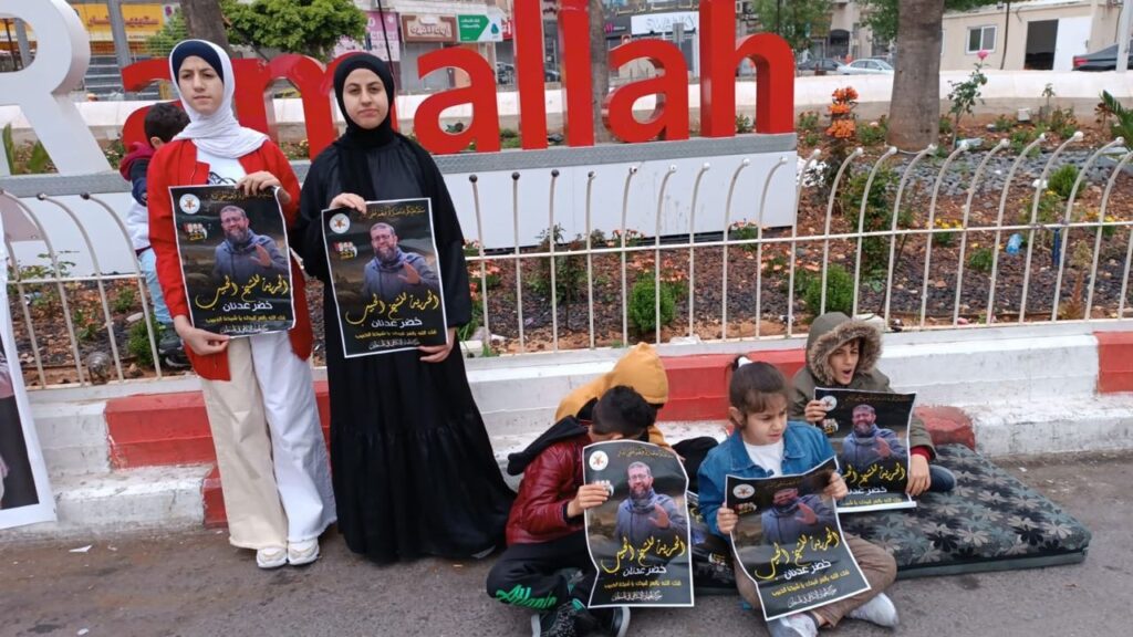 Randa Musa, the wife of Khader Adnan, the Palestinian prisoner currently on his 75th day of hunger strike, issued the following urgent call to action to the people of the world. On Thursday, 20 April, the Israeli occupation military court once again postponed the hearing on his release, ordering yet another report on his medical condition; in the meantime, he was moved to an unknown hospital location, his family reported. Randa, his wife, and their nine children, set up a sit-in in Manara Square in Ramallah, calling on all to join them to stand for Khader’s freedom. Adnan has won his liberation four times before through hunger strikes. We join her call and urge all to participate in demanding his liberation!