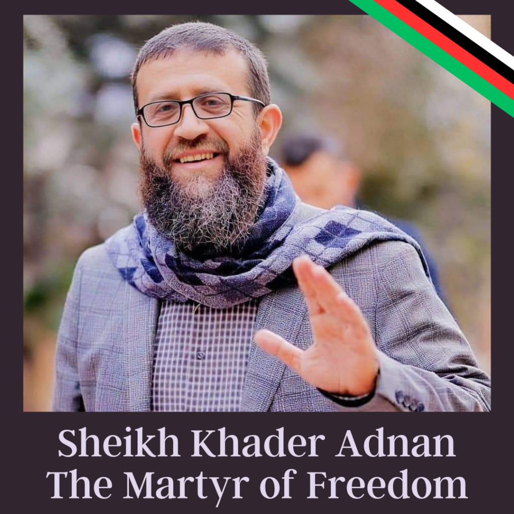 Glory to the martyr, Sheikh Khader Adnan. Freedom for the prisoners, the cause to which he gave his life. Liberation for Palestine, from the river to the sea.