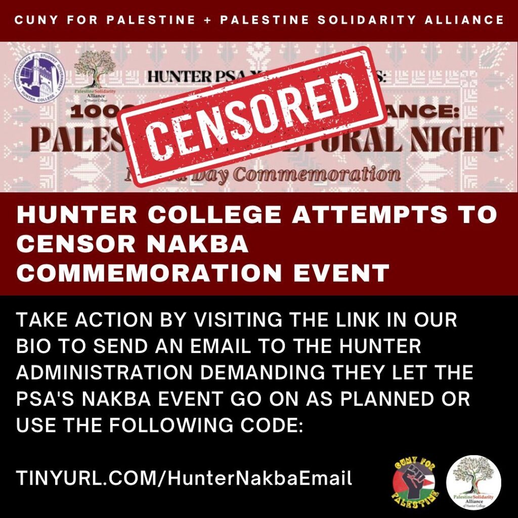 On 15 May — the commemoration of 75 years of ongoing Nakba — CUNY administration at Hunter College announced that they were censoring an event by the Palestine Solidarity Alliance, for the outrageous reason that Nerdeen Kiswani, CUNY alumna, chair of Within Our Lifetime – United For Palestine, and 2022 CUNY Law School graduation speaker, would appear on the program and was “banned from speaking at Hunter.”