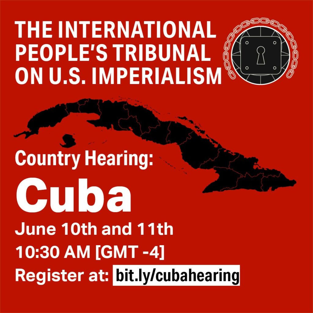 Register today: http://bit.ly/cubahearing Please share these hearing updates with your colleagues and comrades, and watch the Tribunal’s previous hearings at the Sanctions Tribunal YouTube channel! Samidoun Palestinian Prisoner Solidarity Network is a co-sponsor of the Tribunal. Visit the Sanctions Tribunal website to learn more and register for upcoming hearings.