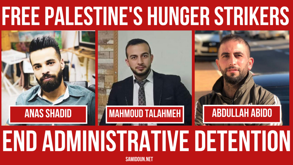 Samidoun Palestinian Prisoner Solidarity Network urges the immediate release of Anas Shadid, Mahmoud Talahmeh and Abdullah Abido, and all Palestinian prisoners in occupation jails. Administrative detention is a colonial weapon used against the Palestinian resistance, and the prisoners and strugglers continue to lead the struggle and resist from behind bars, using all means available to them.