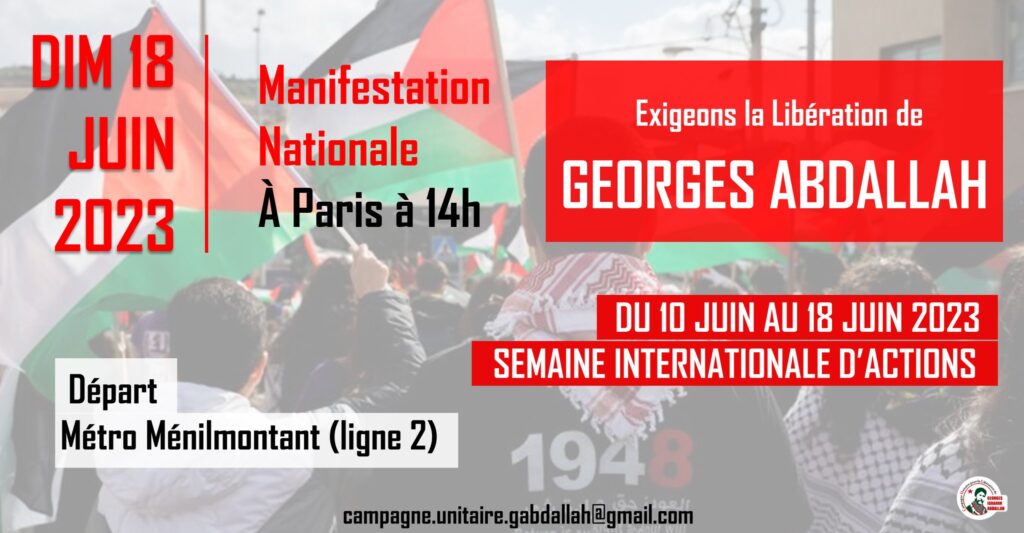 Indeed, Georges Abdallah has become a symbol of state repression and the complicity of French governments, across party lines, with the Israeli occupation and U.S. imperialism. There are several upcoming events and calls to action for the liberation of Georges Abdallah. The Unitary Campaign for the Release of Georges Abdallah is organizing a demonstration in Paris on 18 June, endorsed by the Collectif Palestine Vaincra and Samidoun Paris Banlieue and dozens of organizations, as part of a week of action. The demonstration will take place at 2 pm at Metro Menilmontant.