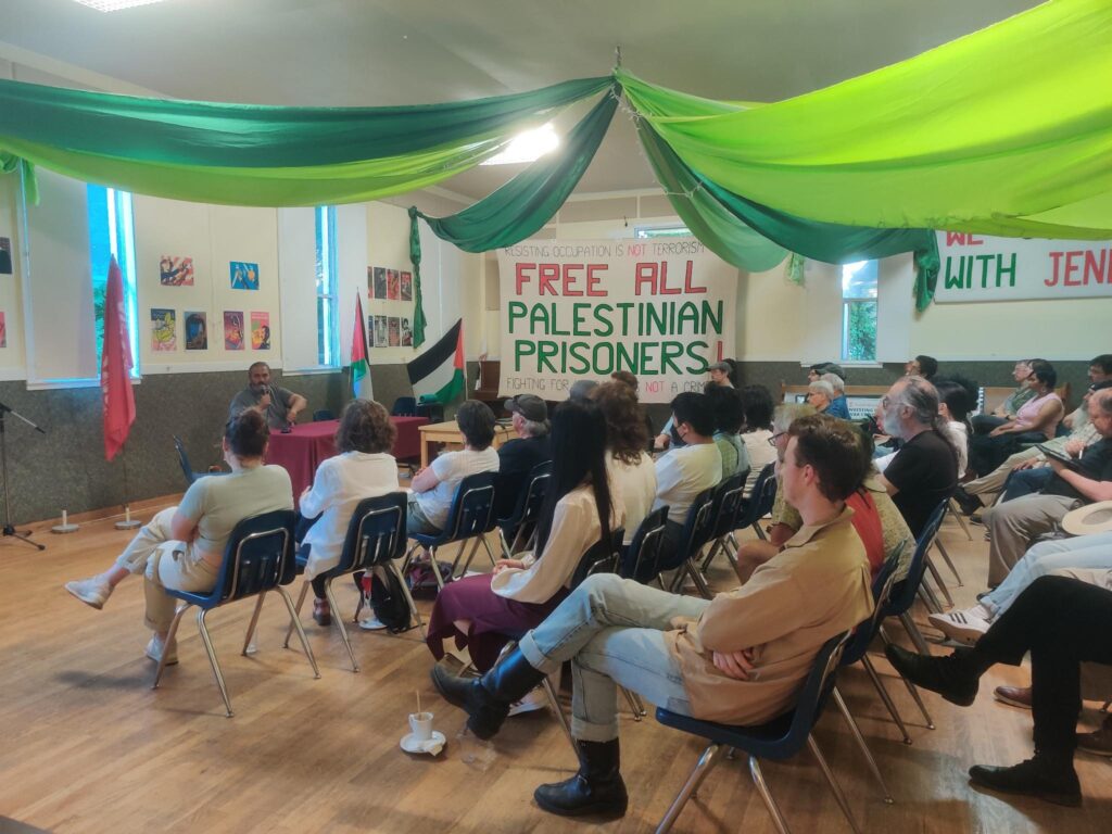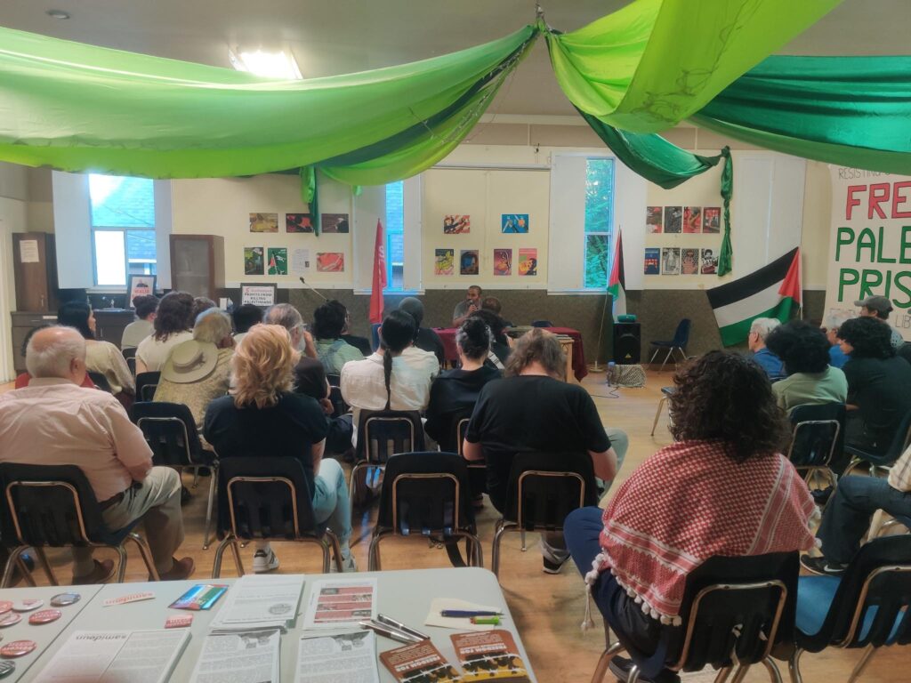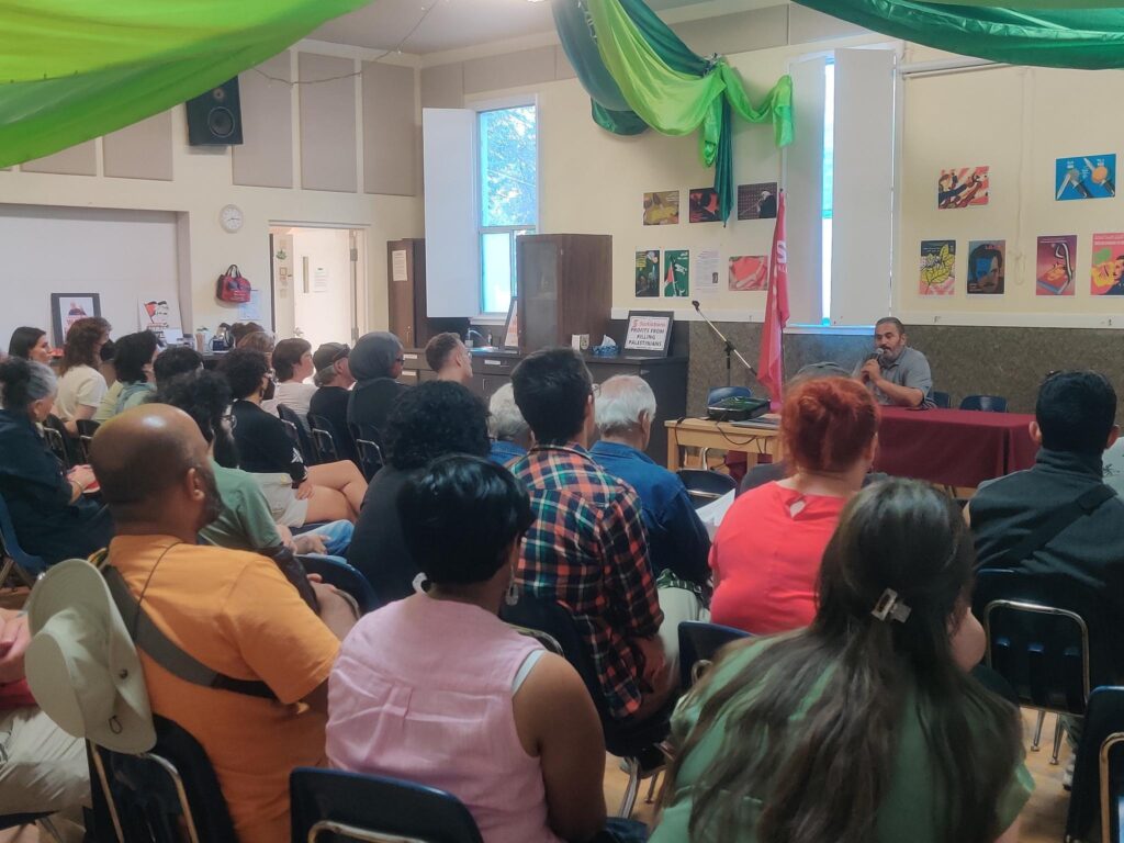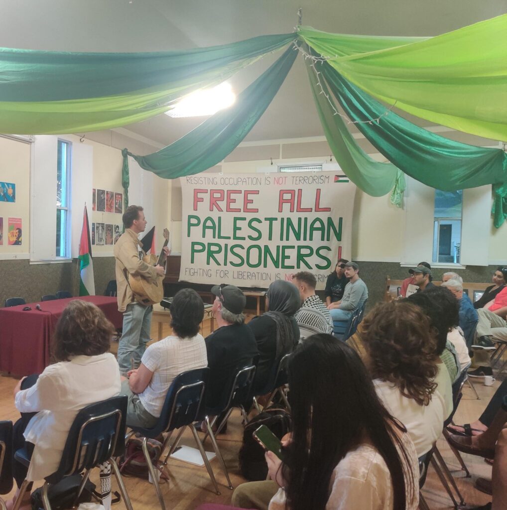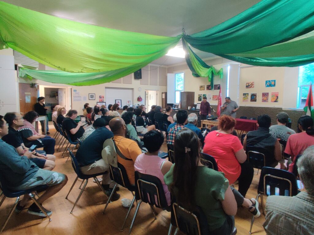 Building on these remarks, Callum of Samidoun Vancouver spoke about the campaign to free the Palestine Action prisoners. There are currently 6 Palestine Action activists jailed in Britain for their direct actions confronting Elbit and other arms dealers, such as Teledyne, after Palestine Action led to the closure of two Elbit facilities in Britain. He highlighted the importance of working-class solidarity in supporting the Actionists, noting the example of fire brigades that refused to remove the actionists, and the support of the Palestinian prisoners’ movement for the Palestine Action campaigners.