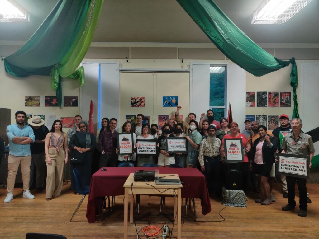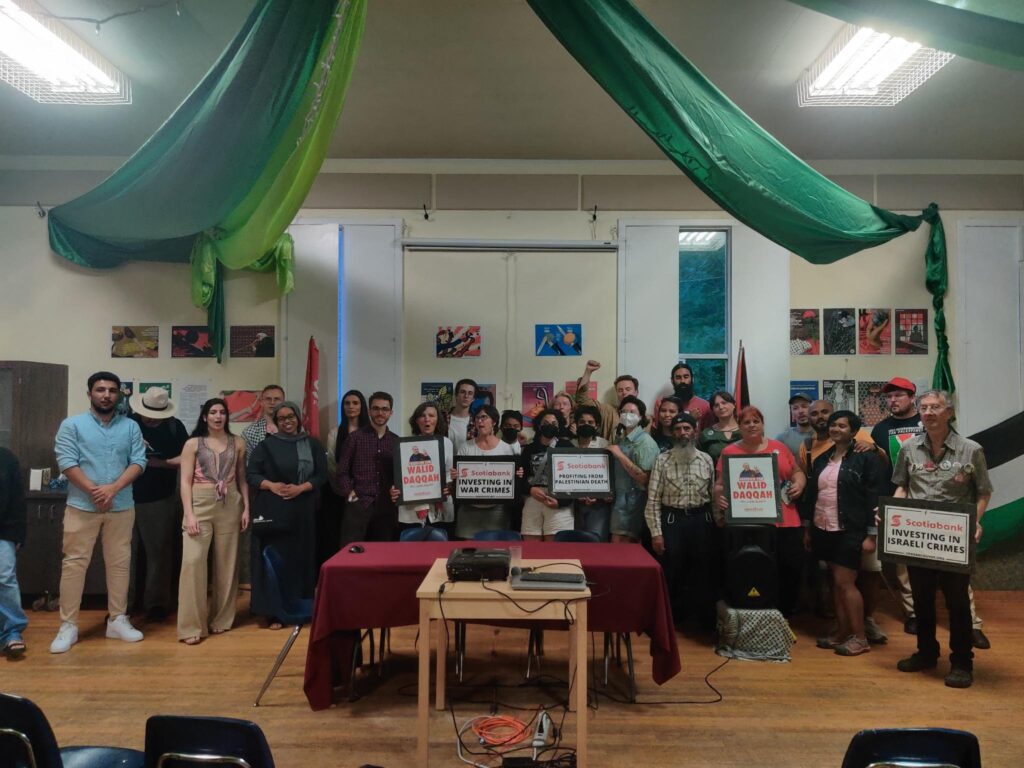 Charlotte Kates, international coordinator of Samidoun, concluded the event, encouraging people attending to get involved in organizing for Palestine and anti-imperialist struggle, and to join in the upcoming events, actions and demonstrations taking place in Vancouver. She invited attendees who wished to participate to take a group solidarity photo with Marc Rudin’s artwork and signs calling for freedom for Walid Daqqah and demanding Scotiabank divest from Elbit Systems.