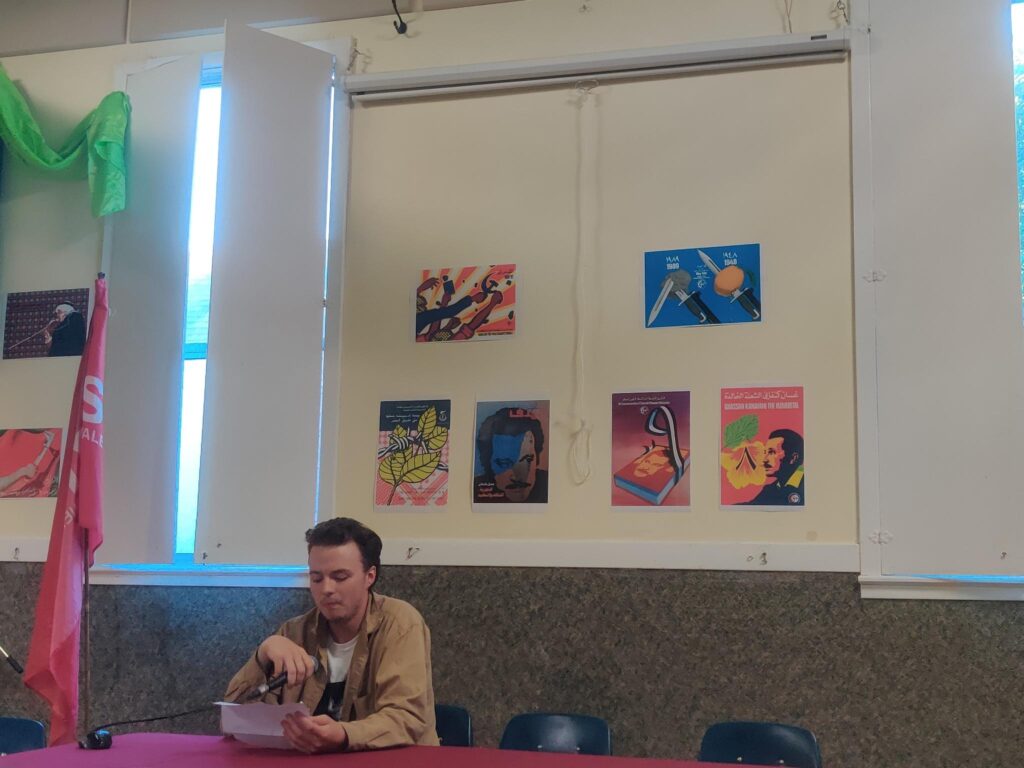 The event concluded with a musical performance by Callum of a song he wrote alongside an English-language poem in honour of the life and struggle of Ghassan Kanafani. Throughout the room, an exhibition of the posters of Marc Rudin/Jihad Mansour was on display. The Swiss revolutionary artist was dedicated for many years to the Palestinian cause and passed away in April of this year. Samidoun Geneva and Secours Rouge Geneva also hosted a week-long exhibition of his work that closed on 8 July, one month after the City of Geneva, bowing to demands by the Israeli embassy, forced the cancellation of an earlier exhibition of his work.
