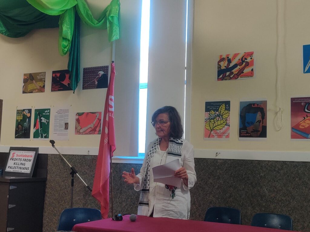 Kathy Copps of BDS Vancouver – Coast Salish, a retired teacher and labour activist, spoke about the growing campaign against Scotiabank (the Bank of Nova Scotia), one of Canada’s largest banks and currently the largest foreign investor in Elbit Systems. Elbit Systems is one of the most notorious Israeli arms manufacturers, producing 85% of the drones used by the occupation forces to target Palestinians throughout occupied Palestine for assassination. Elbit drones were just used earlier this month to assassinate three Palestinians in Jenin camp. Scotiabank is investing approximately $500 million in Elbit. She urged all to join in a campaign to confront Scotiabank and the Canadian government for their complicity in crimes against the Palestinian people, and to join the stand for Palestine and against Scotiabank on Saturday, 22 July.
