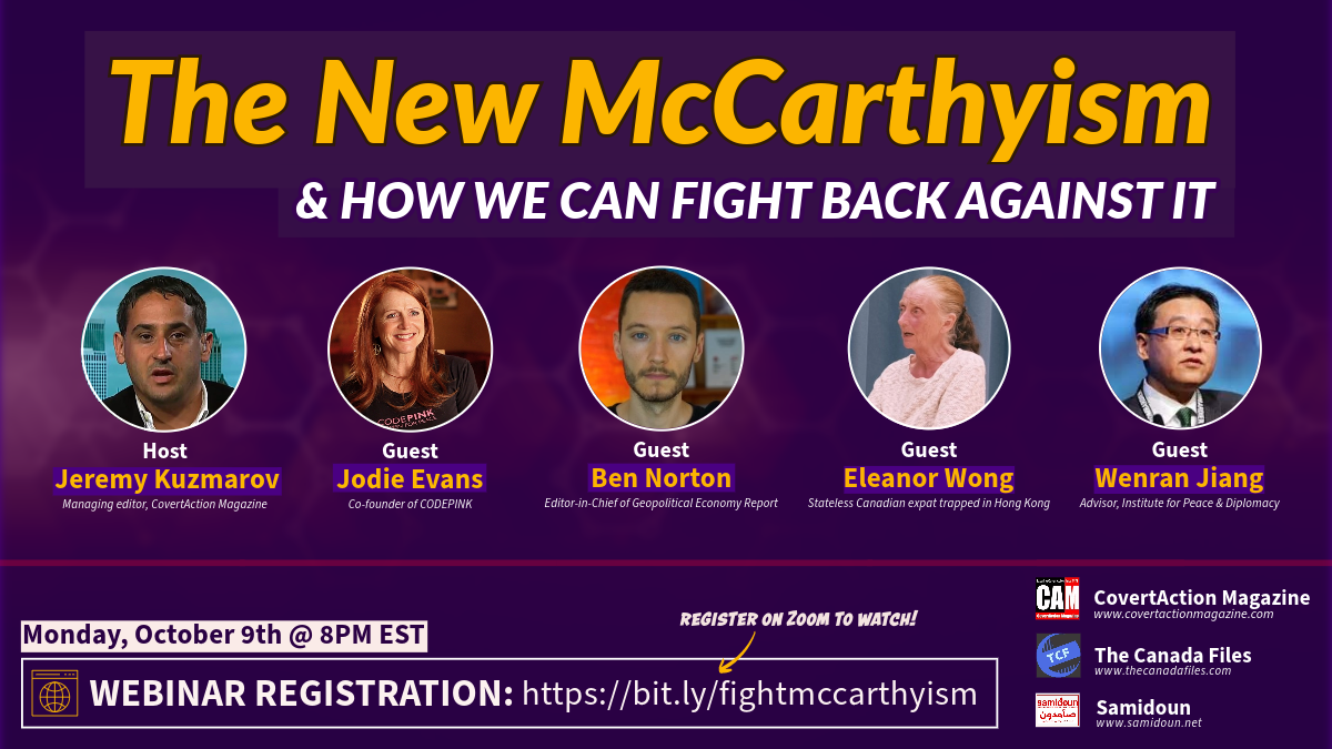 On October 9, 8pm EST, The Canada Files and CovertAction Magazine, with Samidoun as lead sponsor, are co-hosting an event featuring Jodie Evans (Codepink Co-founder), Wenran Jiang (Institute for Peace and Diplomacy advisor), Ben Norton (Geopolitical Economy Report’s Editor-in-Chief) and Eleanor Wong (A stateless Canadian expat exiled in Hong Kong by the Canadian government).