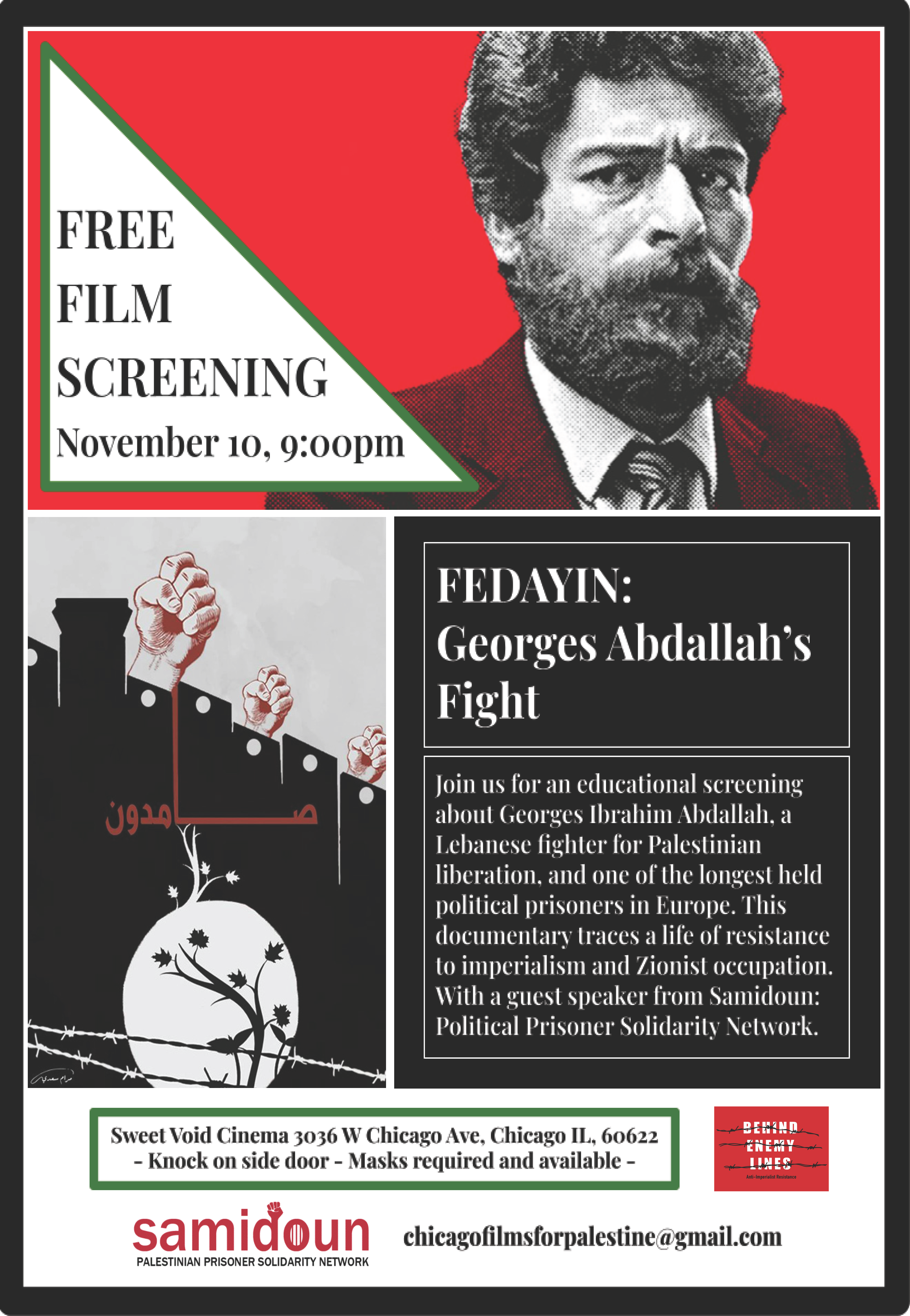 This Friday at 9pm, Sweet Void Cinema is once again teaming up with Chicago Films for Palestine to bring you Fedayin: Georges Abdallah’s Fight. We will have a guest speaker from Samidoun: Political Prisoner Solidarity Network, an introduction prior and a discussion after. Hope to see you there!