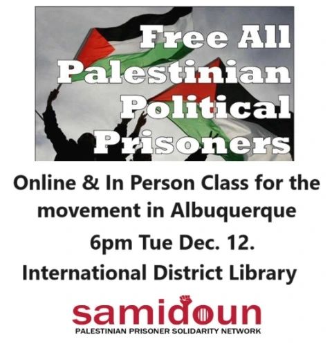 Samidoun Albuquerque is launching a political education project for the growing movement for Palestinian liberation in Albuquerque. Join the session on December 12, “Free all Palestinian Prisoners!”