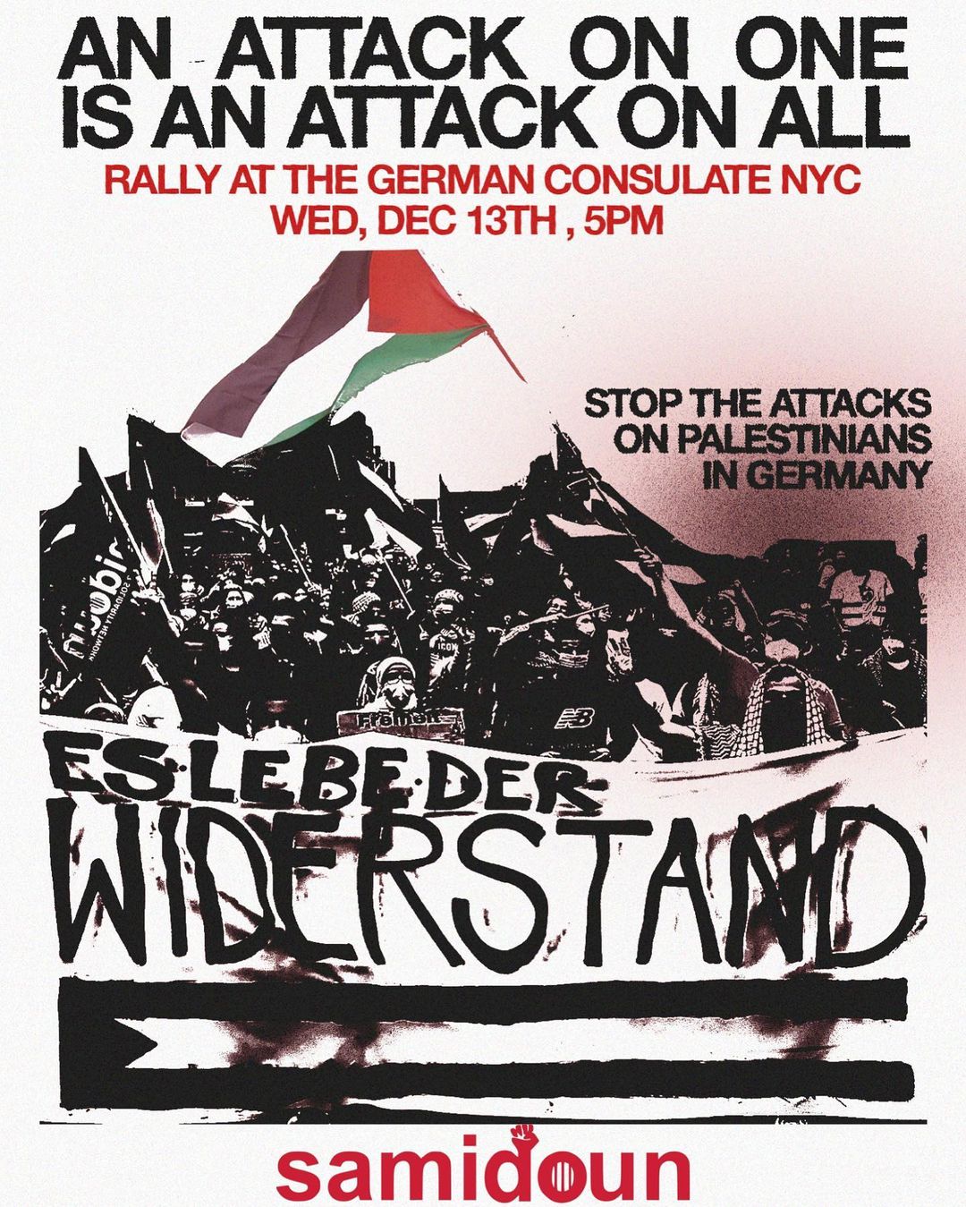 Join us on Wednesday as we stand in solidarity with Palestinians in Germany who have been subjected to brutal repression by the German state. We’re here to say, loud and clear, that an attack on one is an attack on all. Whether the attack is on our brothers and sisters in Palestine, Europe, or New York City, we will be here to stand with them.