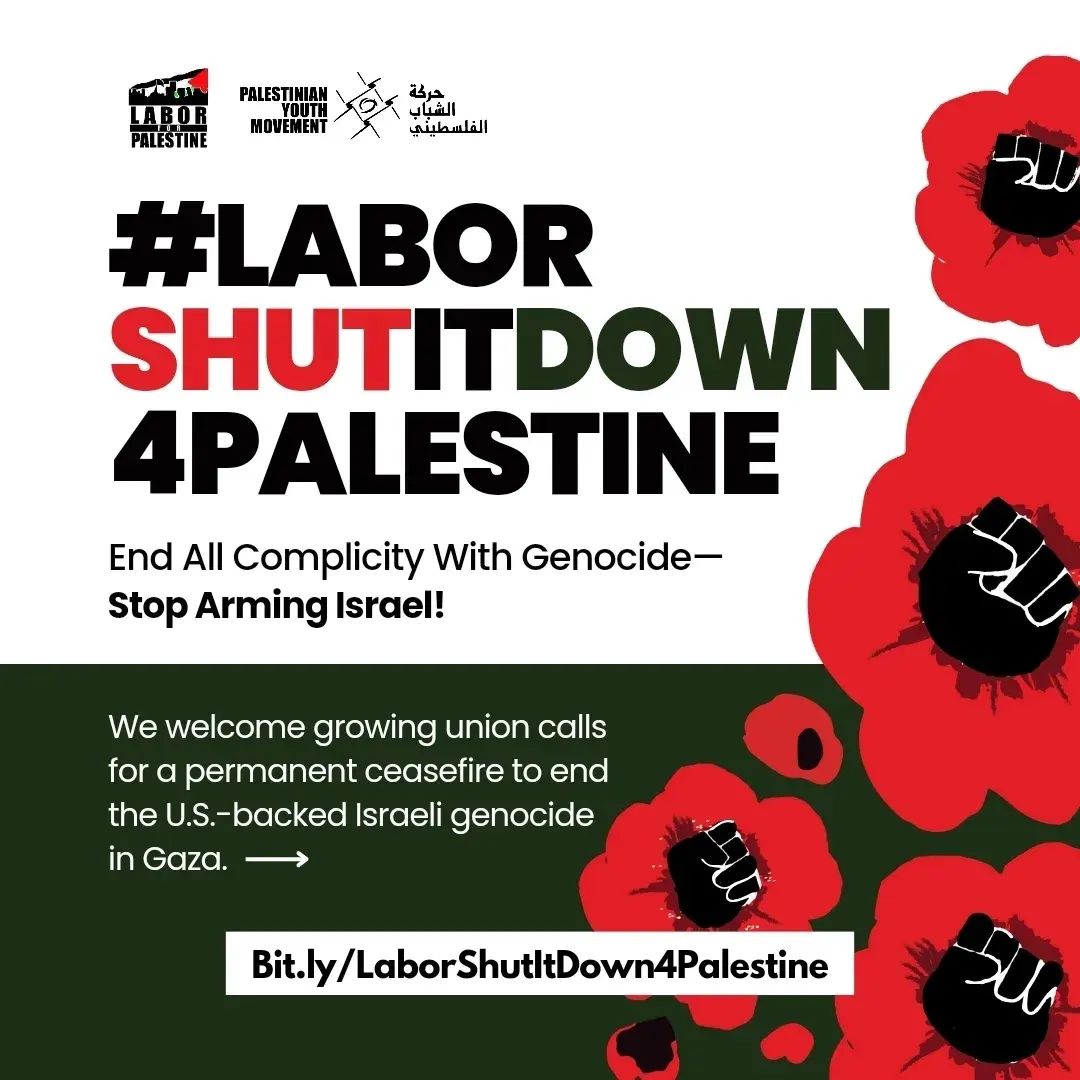 • Join our social media storm by posting: @AFLCIO @TheSOC #LaborShutItDown4Palestine #EndUnionComplicityWithGenocide #StopArmingIsrael #BDS #DumpIsraeliBonds #DroptheHistadrut #FromtherivertotheseaPalestinewillbefree