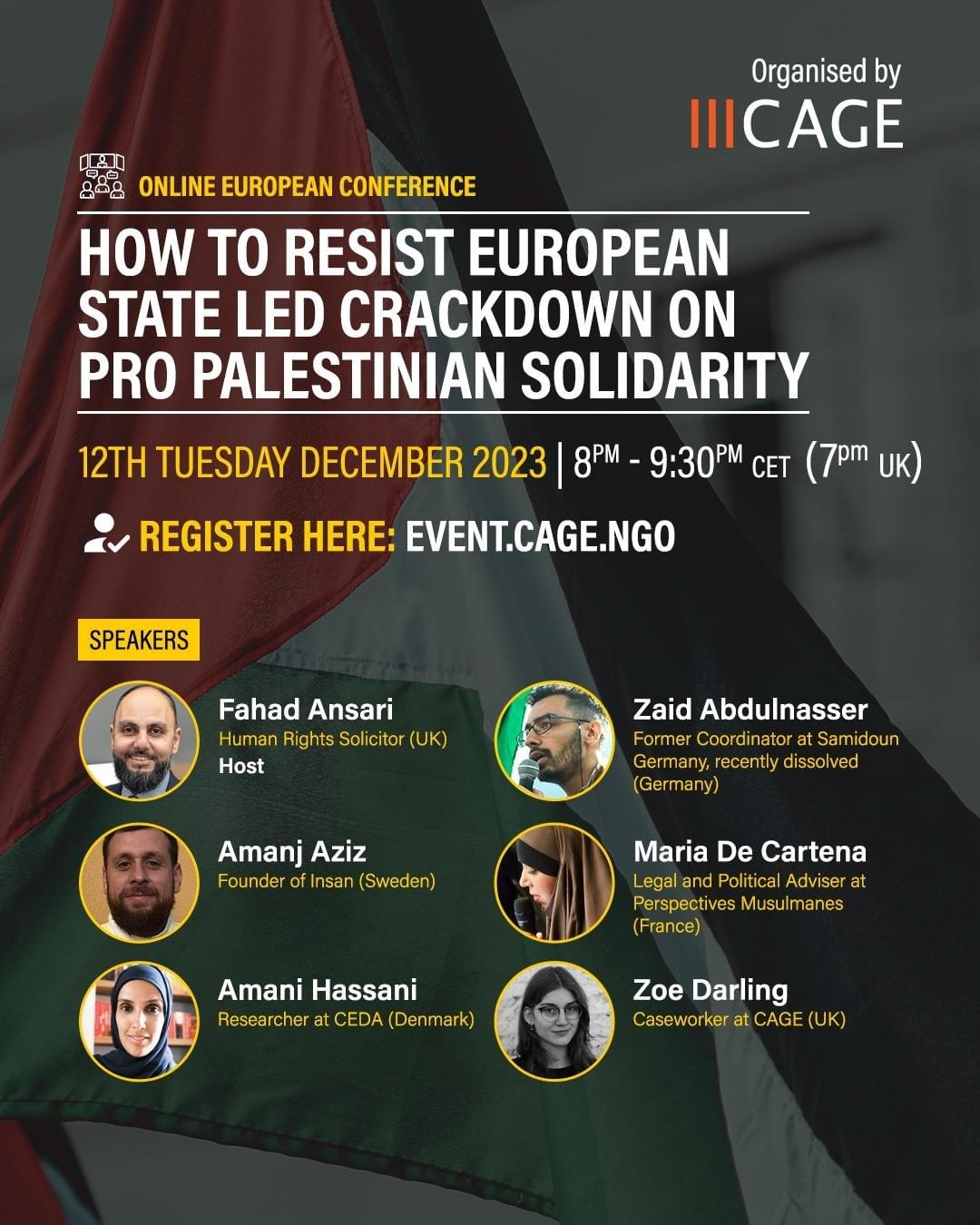 Speakers: Zaid Abdulnasser (former coordinator of Samidoun Germany prior to the ban); Fahad Ansari, human rights solicitor (UK); Amanj Aziz, Insan (Sweden); Maria De Cartena, legal and political advisor at Perspectives Musulmanes (France); Amani Hassani, researcher at CEDA (Denmark); Zoe Darling, caseworker at CAGE