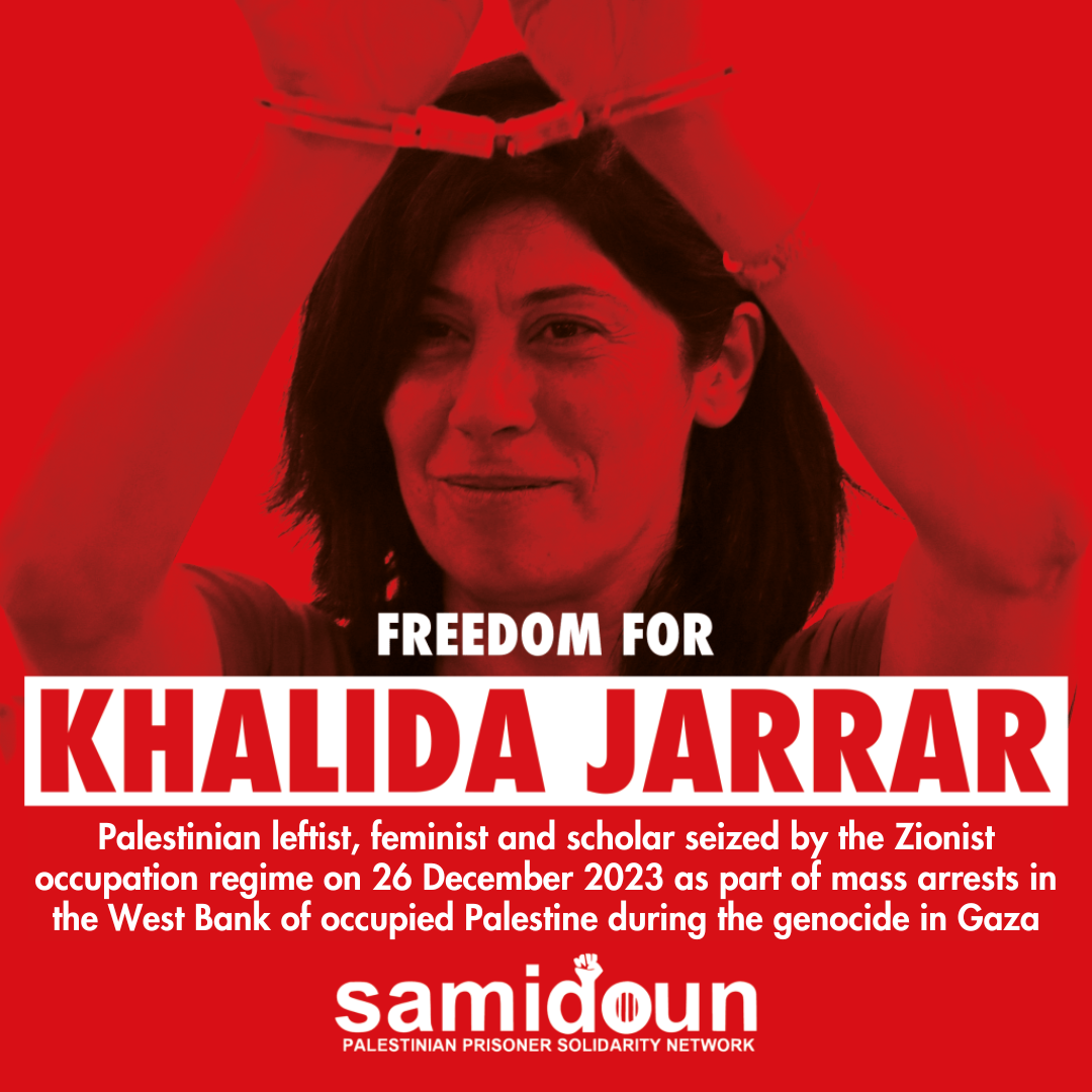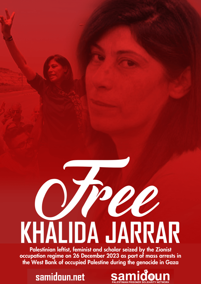 Khalida Jarrar, the Palestinian feminist, leftist, and scholar was seized from her home in El-Bireh, occupied Palestine, in the morning hours of 26 December 2023 as part of mass arrests by Zionist forces in the West Bank of occupied Palestine during the genocide in Gaza.