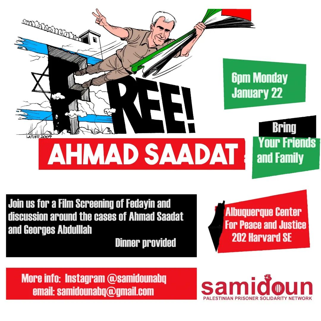 Join us 6pm Monday January 22 in Albuquerque, NM. Film screening of Fedayin. Dinner and Conversation on the cases of Ahmad Sa’adat, Georges Abdallah and the Palestinian Prisoners Movement. All are welcome!