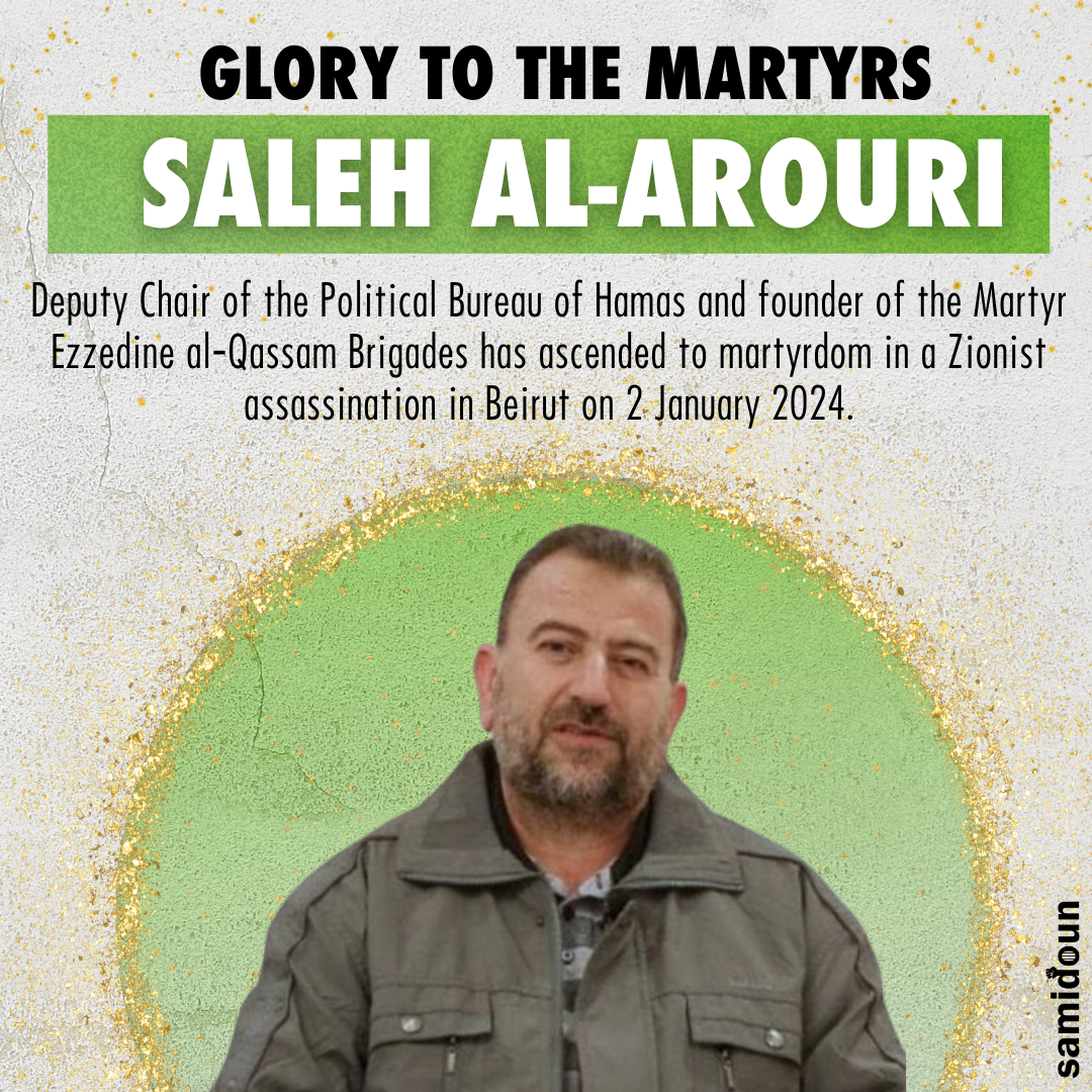 As has been the case for so many such criminal assassinations, they will not achieve the goal of killing the resistance, nor the Palestinian and Arab revolution against Zionism and imperialism. They will not gain an illusory victory through another assassination of a widely respected and beloved leader and struggler, but only inspire greater resistance and struggle toward the defeat of the Zionist regime, the liberation of Palestine from the river to the sea, and the liberation of the Arab people and the region from imperialism and its agents and collaborators. The message for which Saleh al-Arouri was targeted, the symbolism that he holds and the goals for which he gave his life remain, live on and become closer: commitment to unity, to the liberation of the prisoners, the land and the people, and intensification and development of resistance until victory, return and liberation.