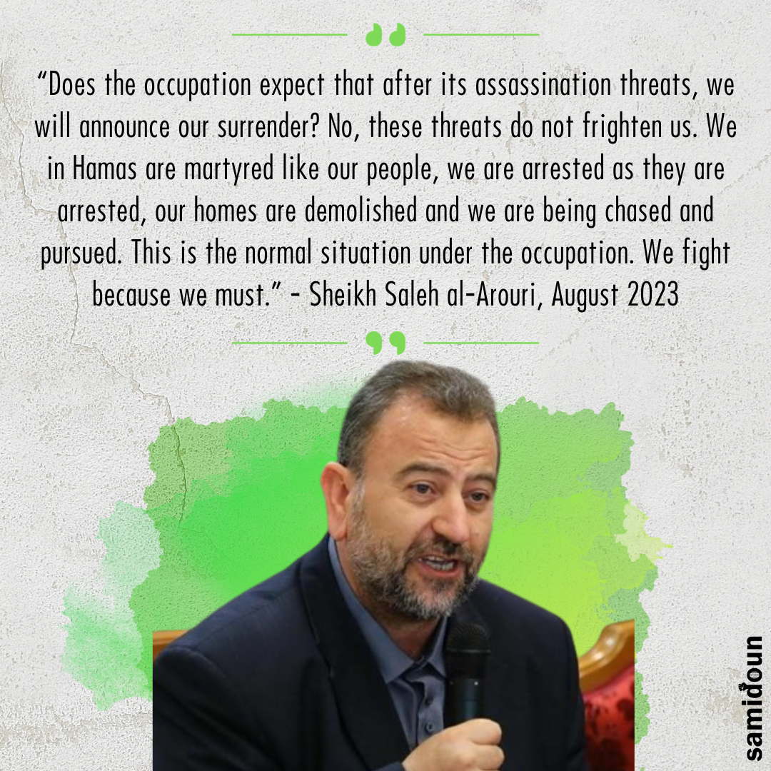 In August 2023, in response to Zionist prime minister Benjamin Netanyahu’s assassination threats, Arouri declared: “Does the occupation expect that after its assassination threats, we will announce our surrender? No, these threats do not frighten us. We in Hamas are martyred like our people, we are arrested as they are arrested, our homes are demolished and we are being chased and pursued. This is the normal situation under the occupation. We fight because we must.”