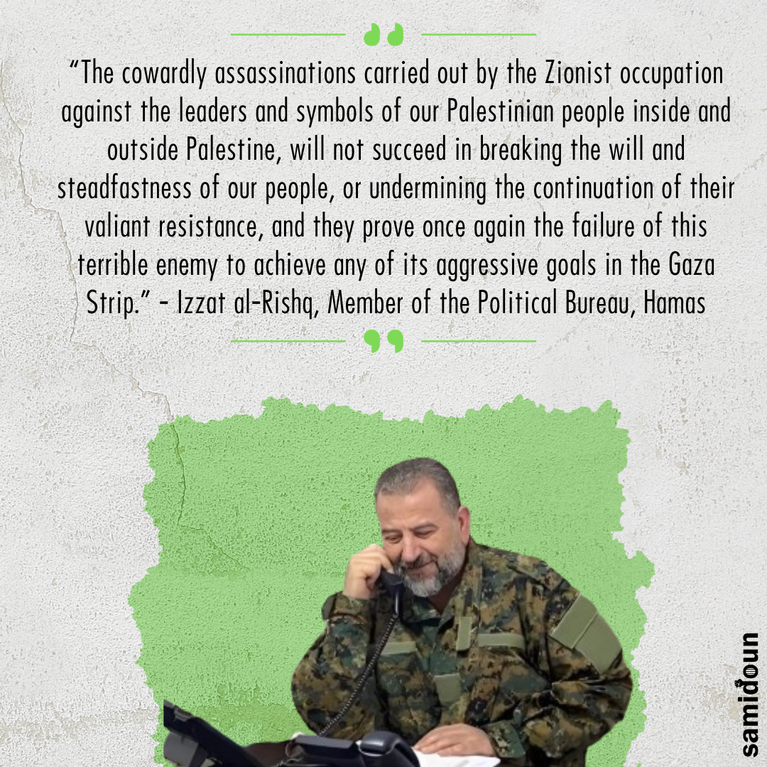 Ismail Haniyeh, the chair of the Political Bureau of Hamas, said: “This is the history of the resistance and the movement: following the assassination of its leaders, it becomes even stronger and more determined.” Izzat al-Rishq, a member of the Political Bureau, reiterated: “The cowardly assassinations carried out by the Zionist occupation against the leaders and symbols of our Palestinian people inside and outside Palestine, will not succeed in breaking the will and steadfastness of our people, or undermining the continuation of their valiant resistance, and they prove once again the failure of this terrible enemy to achieve any of its aggressive goals in the Gaza Strip.”