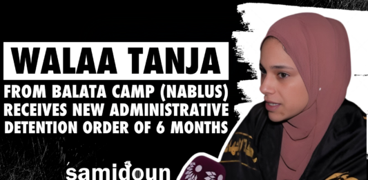 Walaa Khaled Tanja grew up in Balata refugee camp (Nablus), in a family with a strong history of resistance for Palestinian liberation. At the age of 15, she received her mother, Latifa Abu Dara, on Al-Quds Street near the Huwarra checkpoint, when she was released as part of the Wafaa Al-Ahrar prisoner exchange in 2011. … Continue reading Walaa Tanja ordered to 6 more months of arbitrary imprisonment without charge or trial