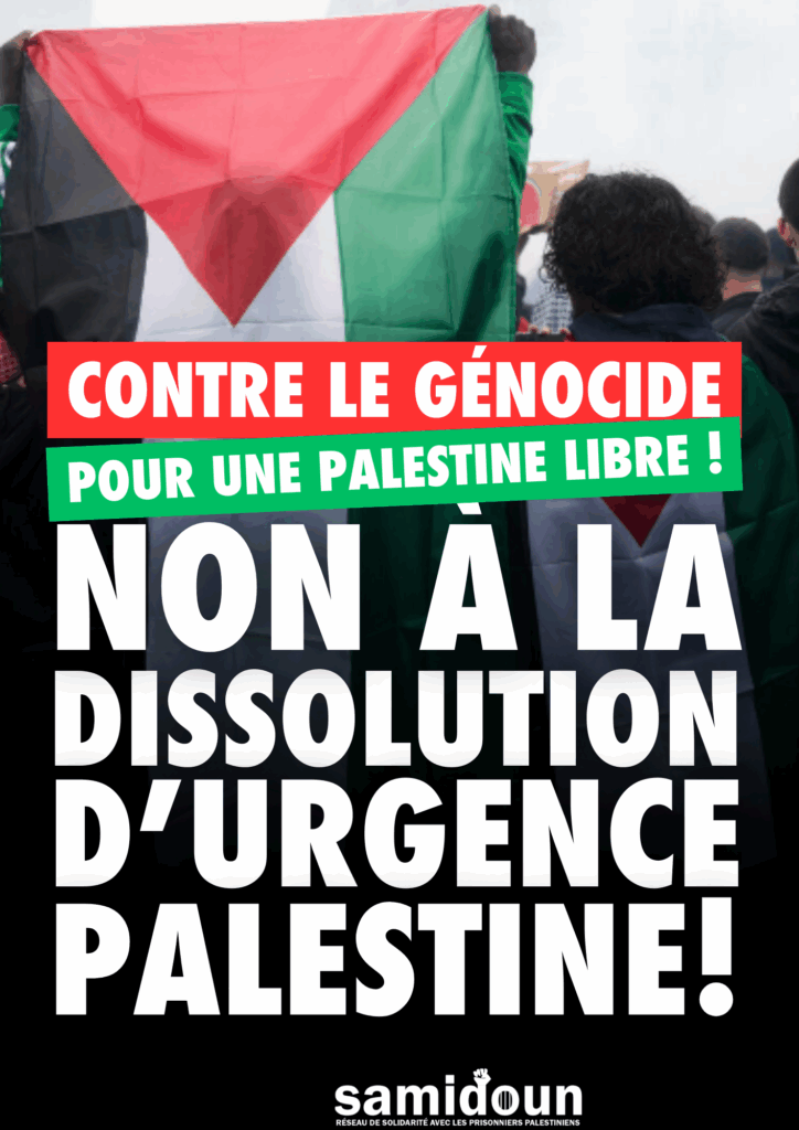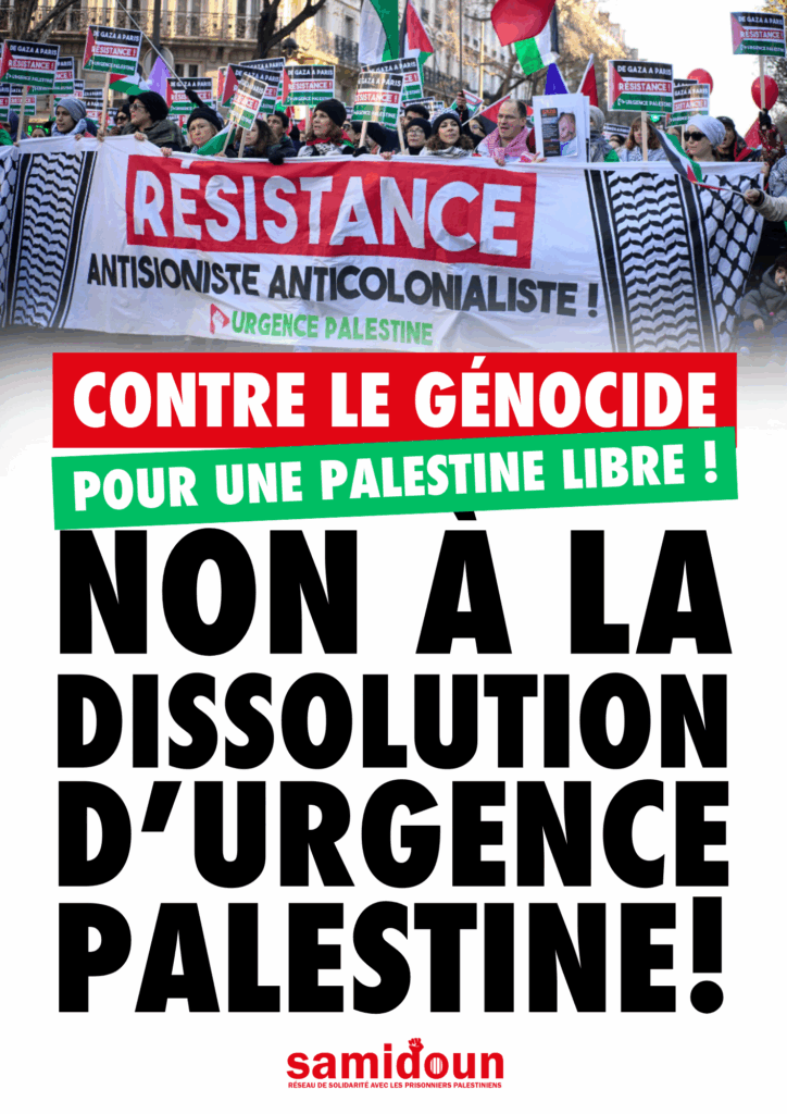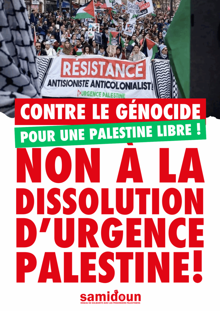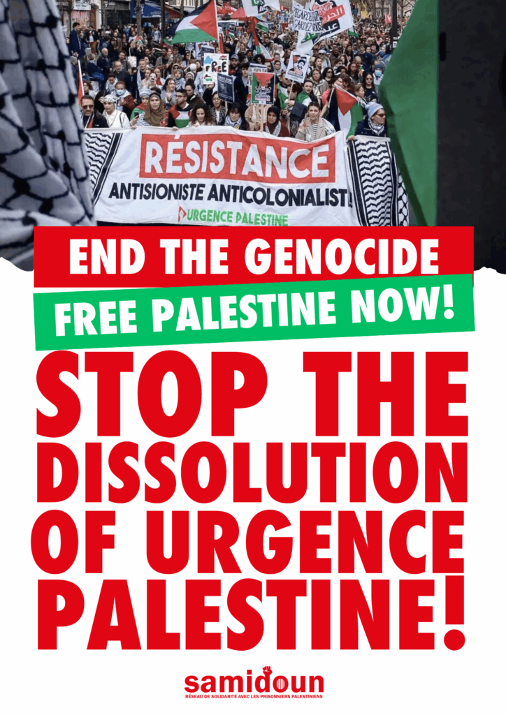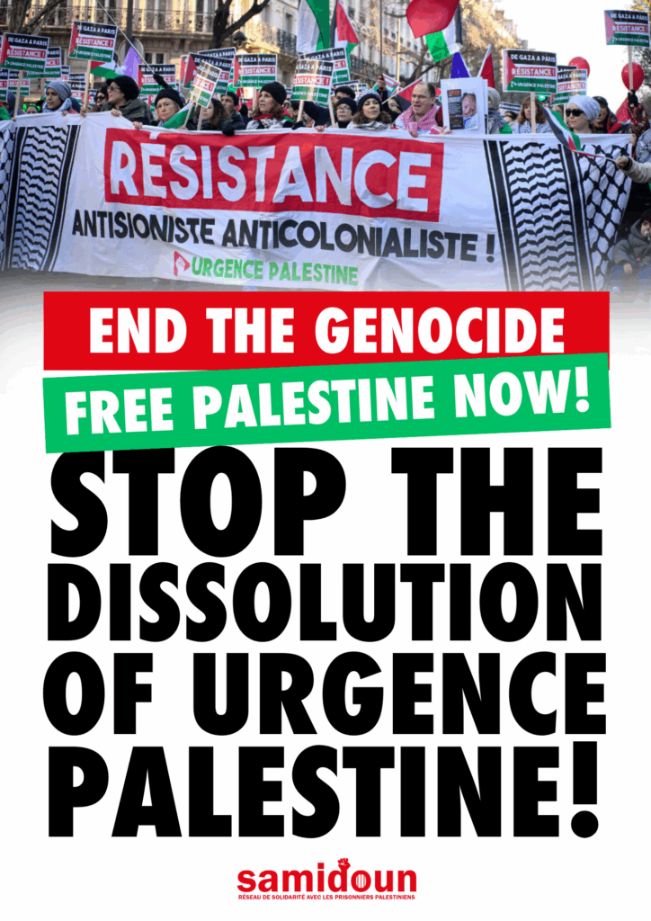 Samidoun Palestinian Prisoner Solidarity Network condemns in the strongest terms the announced plans of the French state to “dissolve” — that is, effectively ban — Urgence Palestine, the large national coalition and collective for Palestine that has risen to the forefront of the movement in France over the past 18 months of resistance to Zionist-imperialist genocide. On the evening of 29 April, Urgence Palestine revealed that the French state had delivered a notice of dissolution, stating that the organization would be dissolved effectively on 7 May if the attack is not blocked by legal action. This is, of course, only the latest action of the French state against the Palestine liberation movement and a further expression of its complicity in and responsibility for the ongoing genocide in Gaza and throughout occupied Palestine, as well as its vicious repression of the Palestinian liberation movement and Palestine solidarity within France itself.