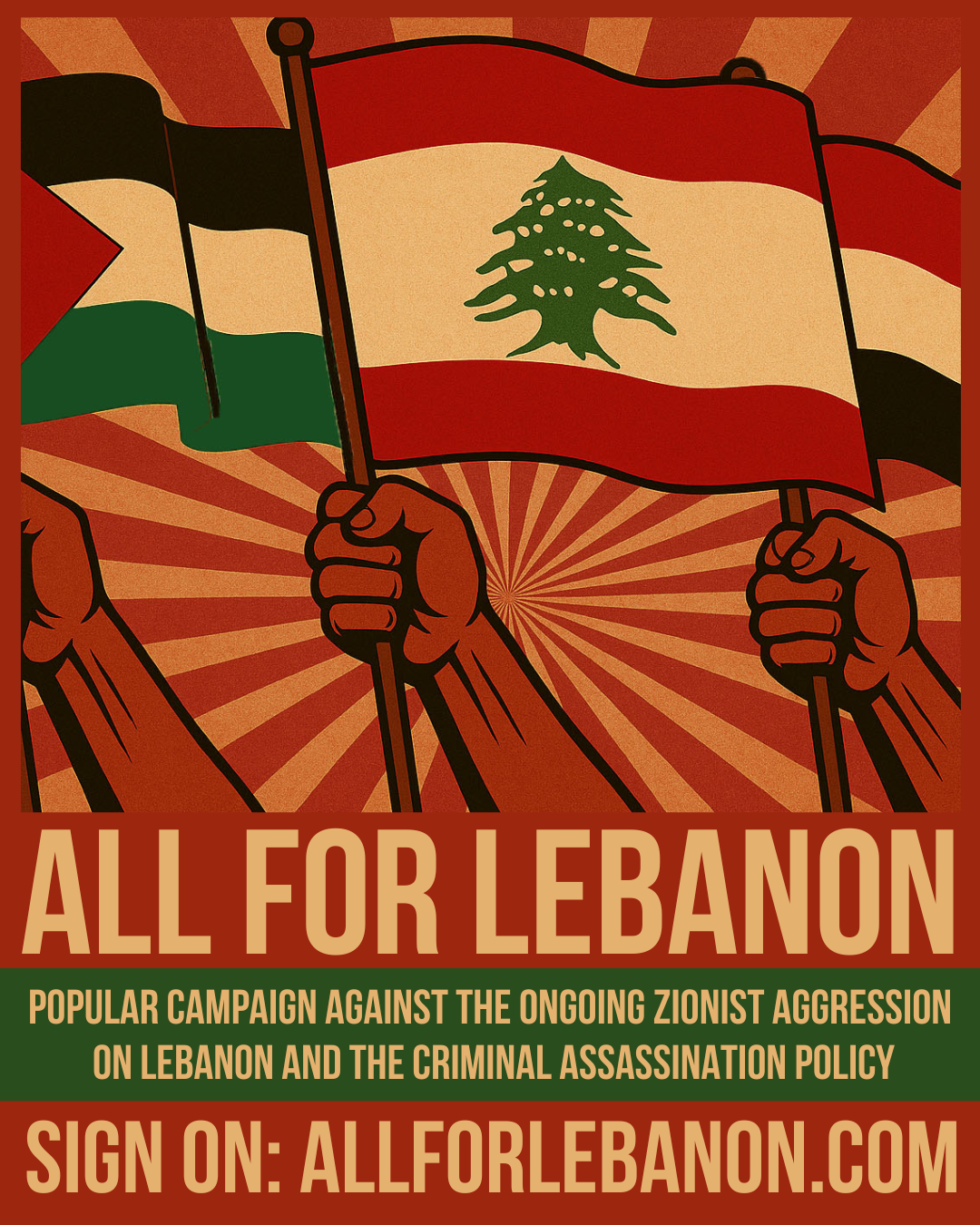The Masar Badil, the Palestinian Alternative Revolutionary Path Movement, has launched a new campaign: All for Lebanon: Popular Campaign Against the Ongoing Zionist Aggression on Lebanon and the Assassination Policy, with a global petition in support of Lebanon and its people — and of Palestine — at this time of daily assaults by the Zionist regime that come hand in hand with their genocide in Gaza.