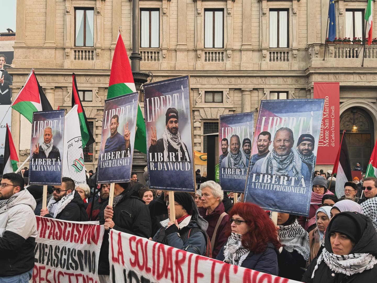 On Saturday, 3 January, protesters gathered in Piazza Scala in Milano with signs calling for the liberation of Hannoun, Dawoud, Yaser El-Assaly and their fellow Palestinian prisoners — both in Italy and in Palestine. Simultaneously, another protest was organized in Genova — Hannoun’s hometown in Italy — calling for their freedom; protests have also been organized in Brugherio, outside the Monza prison, and in Napoli.