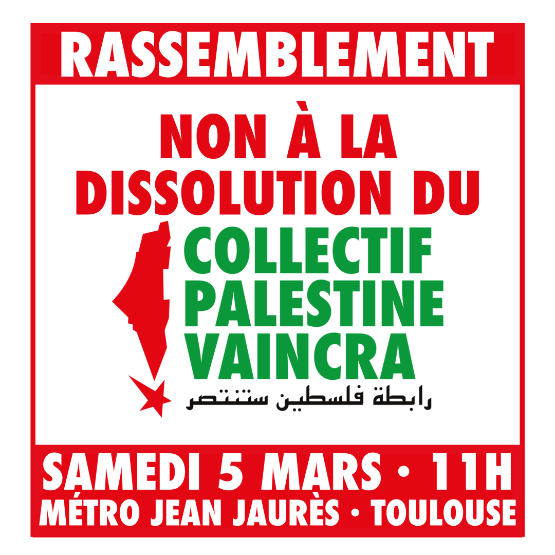 With the support of: AFA Tolosa, ATTAC Toulouse, Couserans-Palestine Association, BRIC, Toulouse BDS Campaign, CGT 31, Center of the Kurdish Democratic Community of Toulouse, CLRR 31, Collectif Palestine Vaincra, Truth and Justice Committee 31, CNT 31, FSU 31, Peace Movement 31, NPA 31, Permanent Revolution 31, Sud Education 31/65, Secours Rouge Toulouse, Solidaires 31, Survival Toulouse, Union of Students of Toulouse