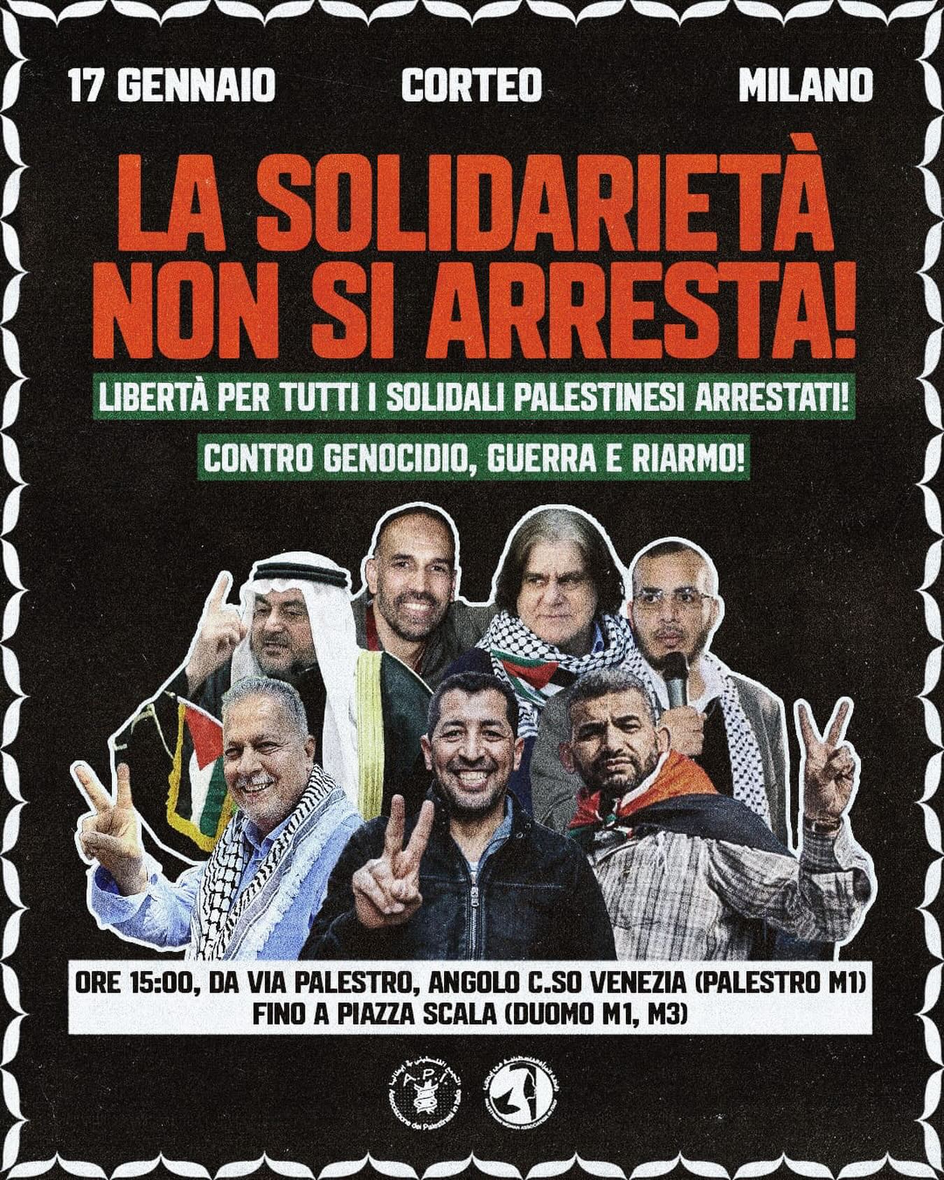 Tomorrow, on 17 January, there will be a mass gathering in Milano, at Via Palestro (Angolo C. So Venezia, Palestro M1) at 3 pm (15h), marching to Piazza Scala, in solidarity with all of the Palestinian political prisoners in Italy — Mohammad Hannoun, Ra’ed Dawoud, Yasser Elasaly, Khalil Abu Deiah, Reyad Albustanji, Adel Abu Rawwa, Raed Al-Salahat, Anan Yaeesh, Ali Irar, Mansour Doghmosh and Ahmed Salem.